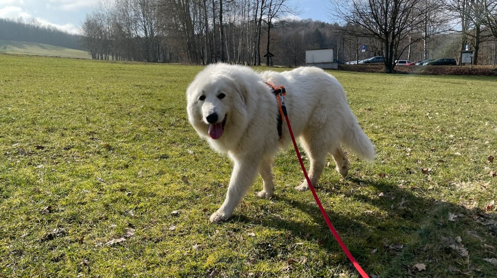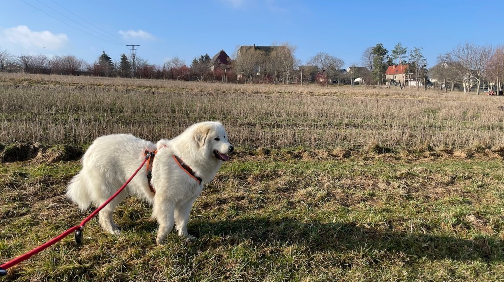 Wir sind dann schön gemütlich durch mein Wohngebiet geschlendert. Mein großer Mensch hat gesagt, wir gehen zur Wiese hinter meinem Wohngebiet. Und da weiß die Bella gleich, wo sie langlaufen muß.