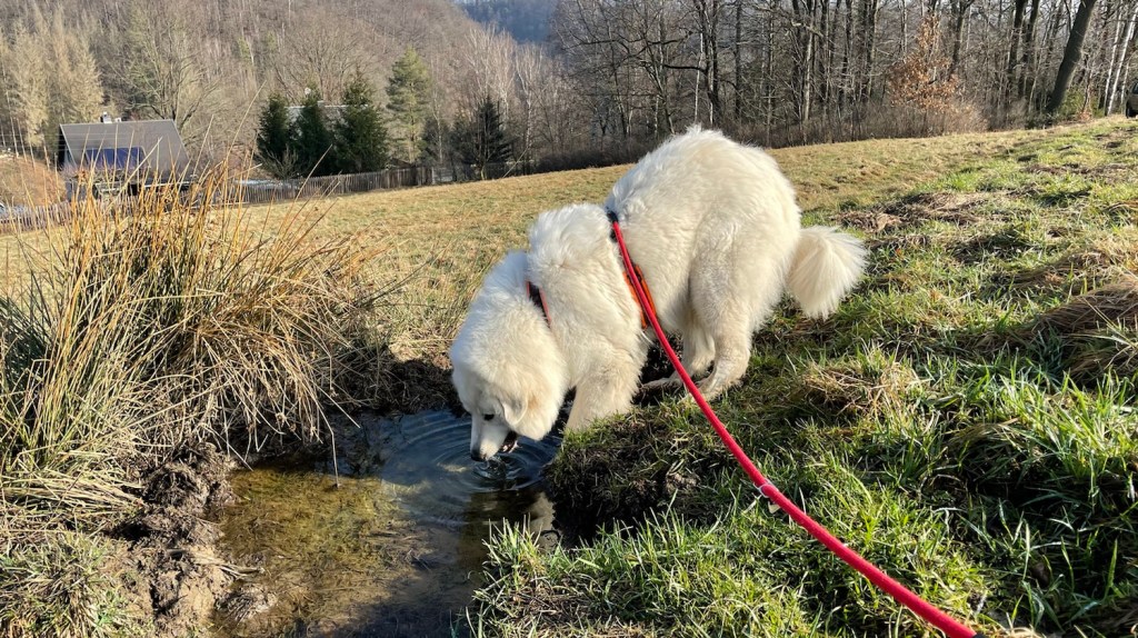 Dann sind wir über die große Wiese gelaufen und ich habe wieder schön geschnuffelt. Weiter ging es dann vorbei an der kleinen Wiese bis zum Teich. Da ist jetzt kein hartes Wasser mehr drin und so konnte ich unbehindert trinken. Dann bin ich mit meinem großen Mensch den Feldweg lang über das Feld gewandert.