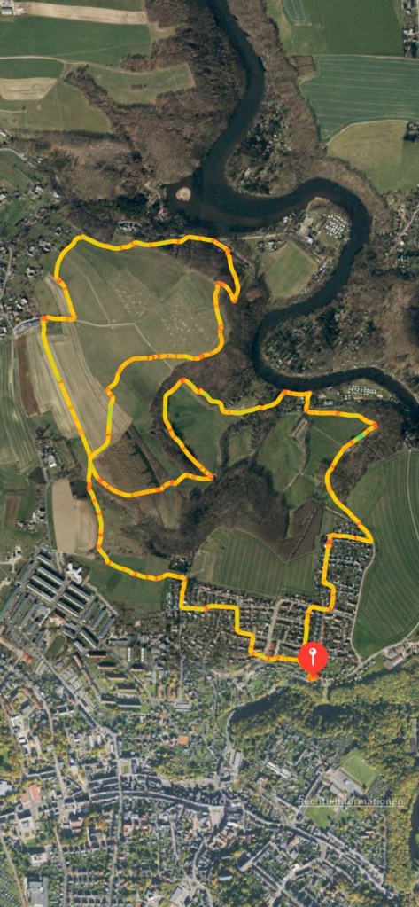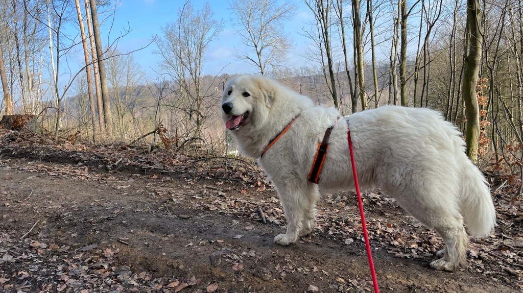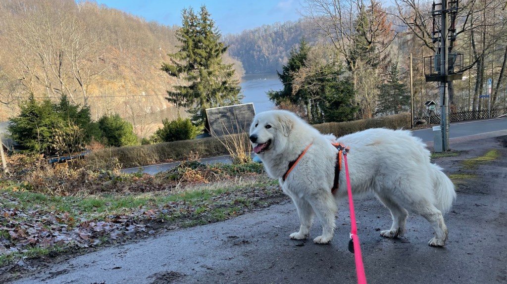 Dann sind wir weiter zum „Waldhaus“. Da haben wir schön über den großen Fluß mit dem komischen Namen geguckt. Und da sind wir wieder in den Wald rein und den Berg hoch zur großen Wiese. Im Wald habe ich aber schon was erschnuffelt. Und auf der großen Wiese hinter dem Wald waren dann auch die Rehe. Mein großer Mensch hat die auch gesehen. Ich nicht, ich habe die nur geschnuffelt. Die hauen immer ab vor mir. Dabei will ich doch mal mit denen spielen.