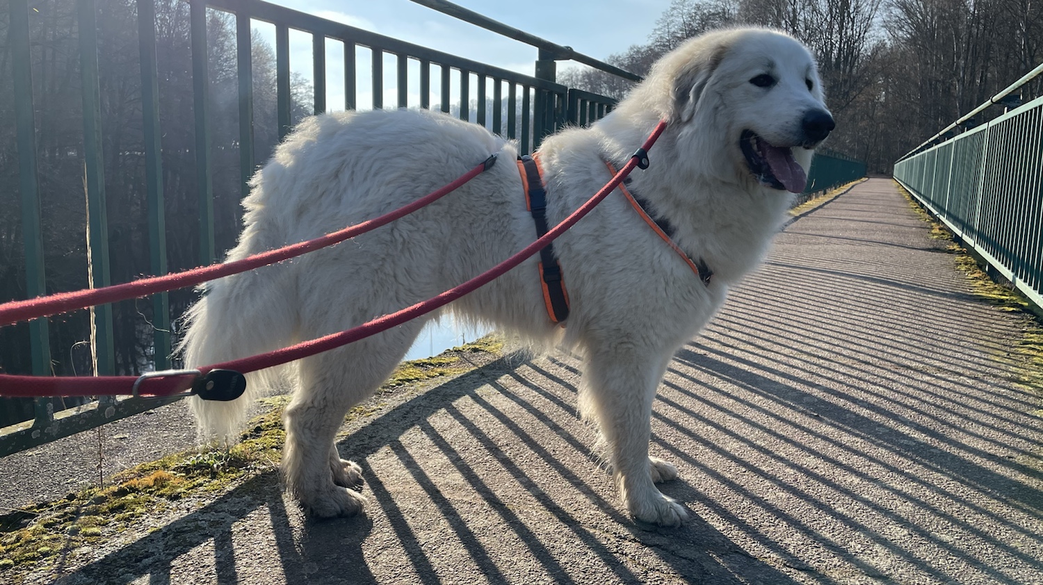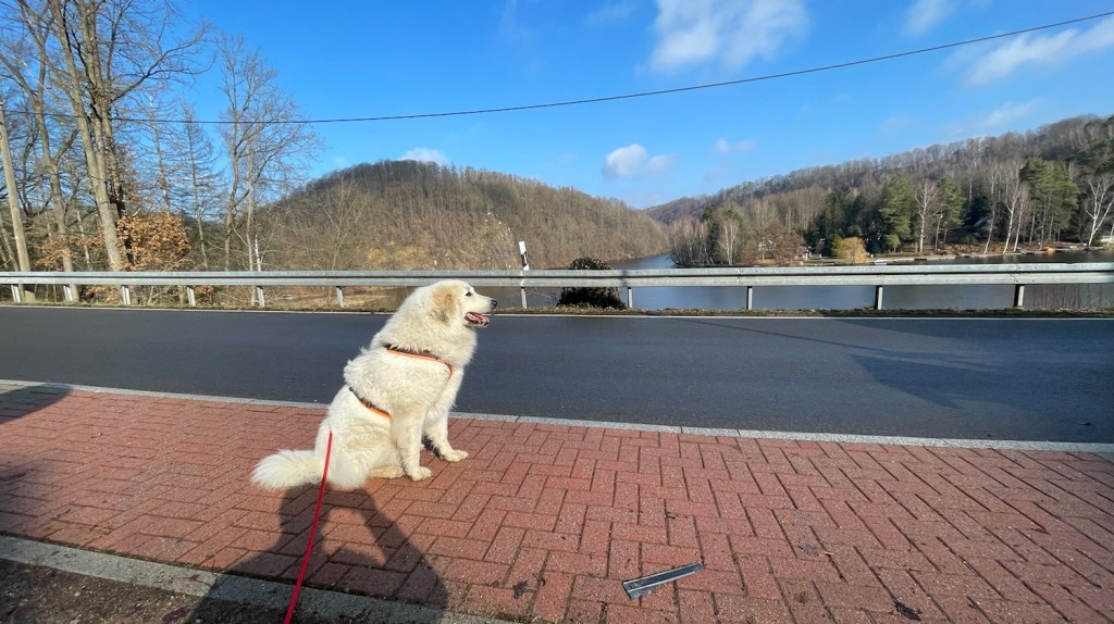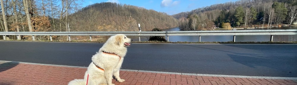 Dann sind wir zur großen Brücke die nicht wackelt und wieder auf die andere Seite vom großen Fluß. Ich bin dann noch mit meinem großen Mensch über die Wiese an der Tschooo-Pauuu gelaufen. Danach sind wir wieder auf den Wanderweg und durch den Wald bis zum Husky Spike. Der war aber nicht in seinem Garten.