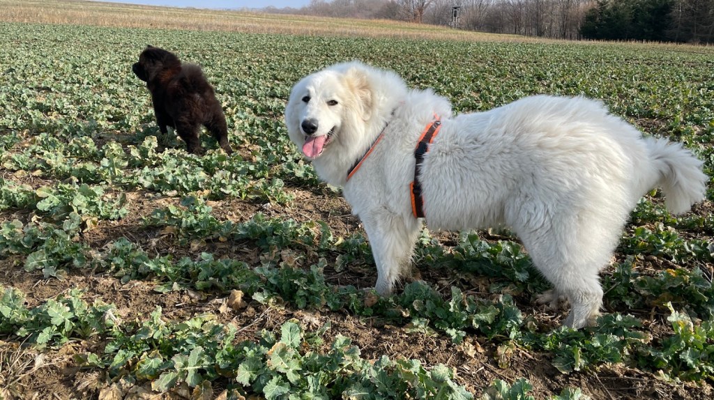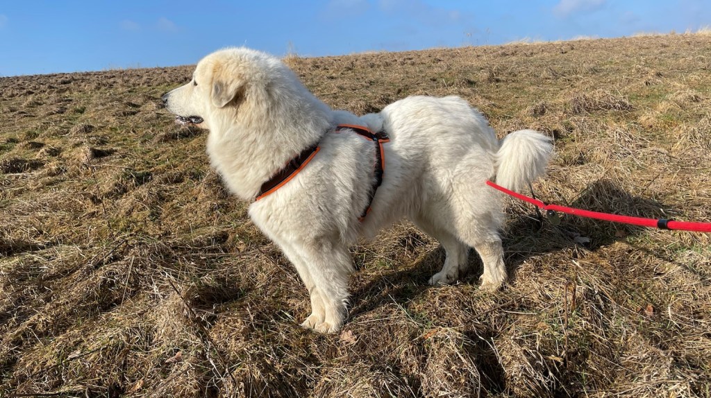 Wir sind dann über die ganze große Wiese gelaufen und wollten zum Skihang gehen. Aber da haben wir über das Feld auf dem Feldweg was gesehen – den Johann. Der ist ein Chow Chow und mein Freund. Und da habe ich meinen großen Mensch quer über das Feld gezerrt. Und dann habe ich mit dem Johann gespielt.
