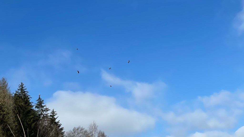 Am Skihang war en Menschen. Und die haben die Reiher beobachtet. Die wohnen nämlich auf den großen Bäumen an der Fuchsfarm. Acht Stück hat mein großer Mensch gezählt. Voriges Jahr haben wir die auch schon beobachtet. Da waren es aber nur zwei.