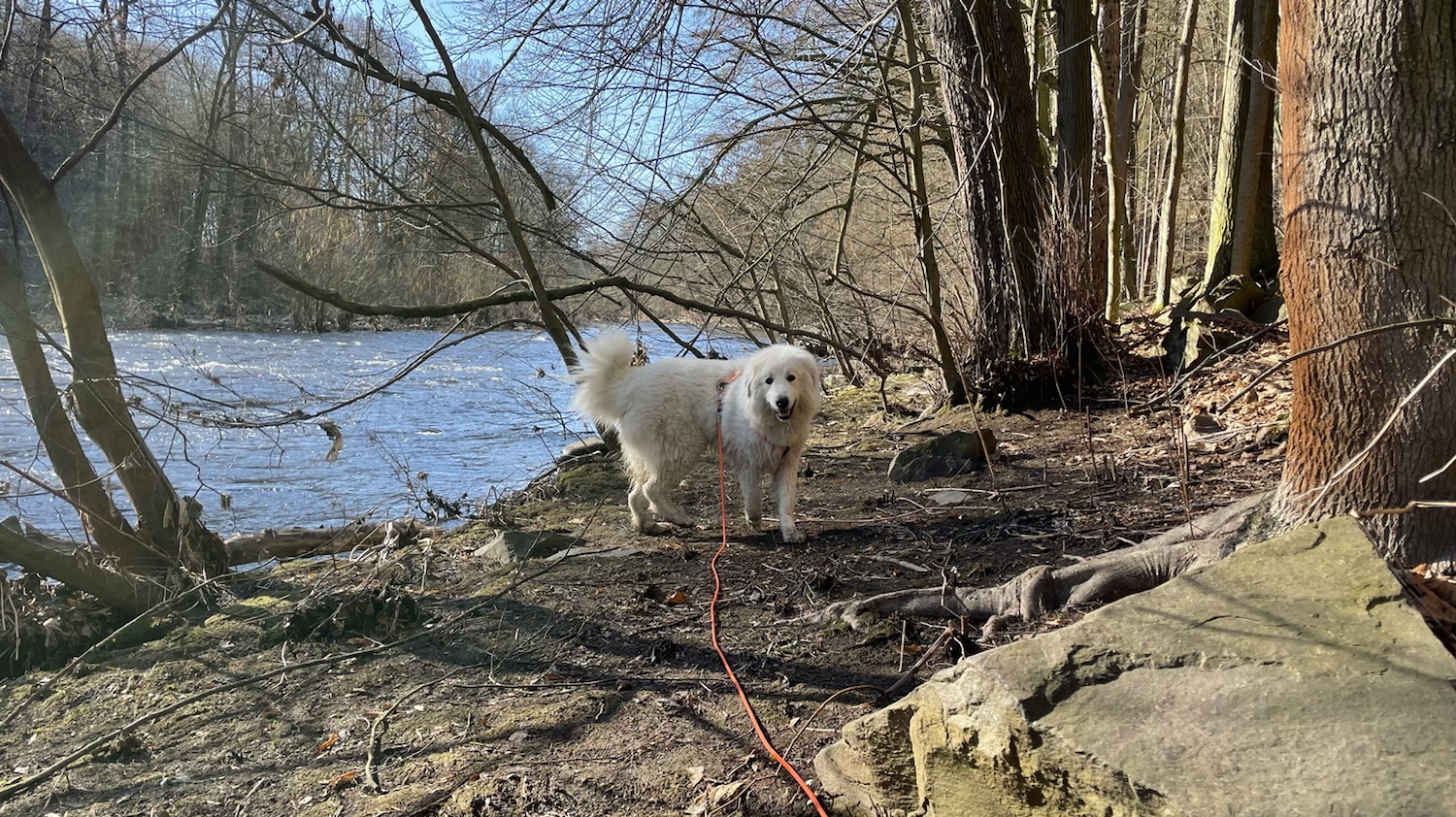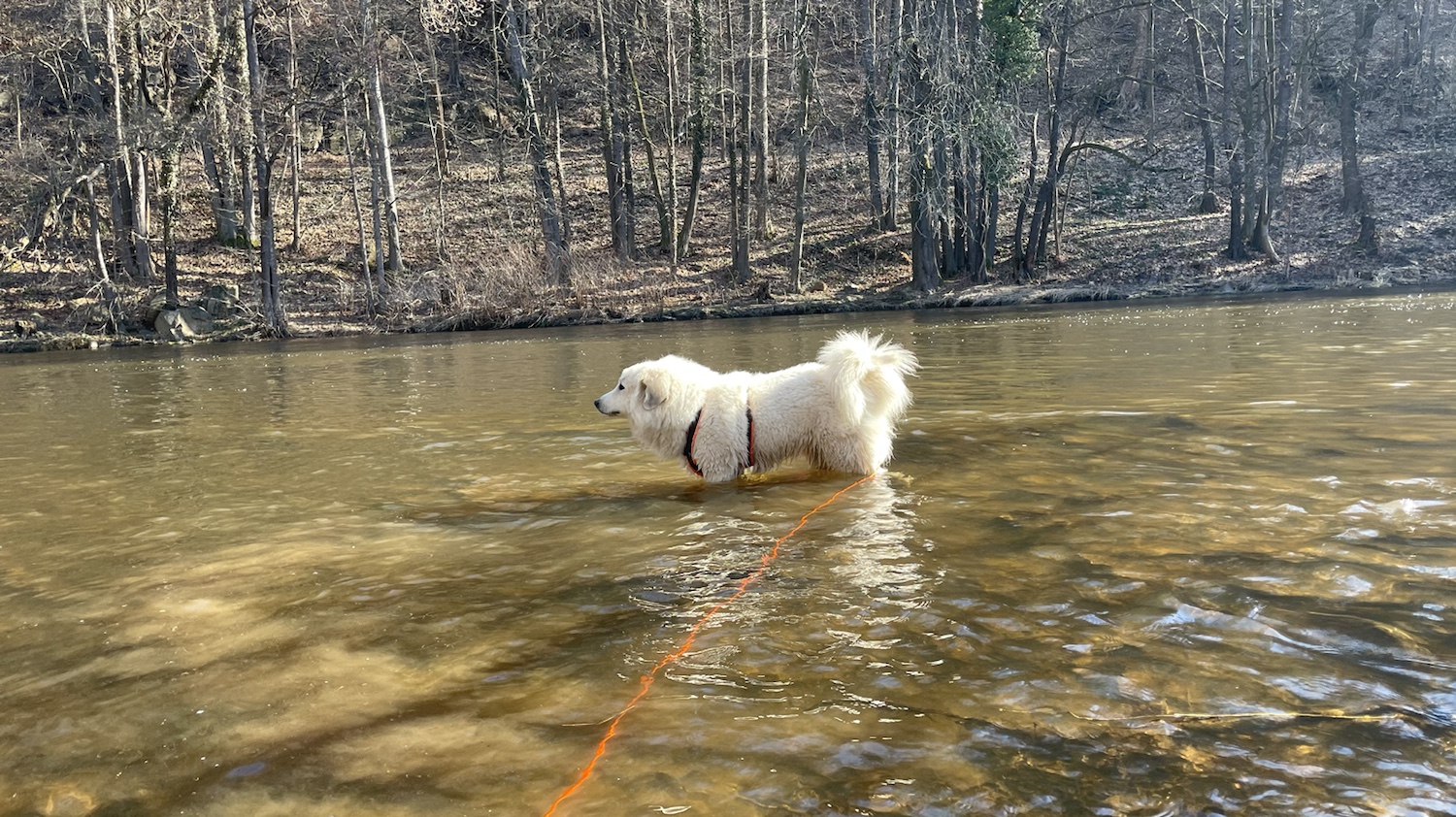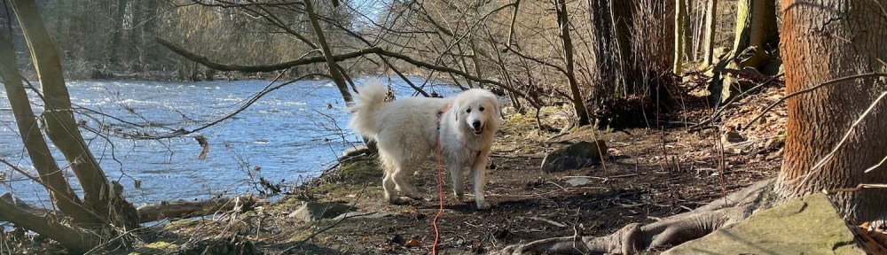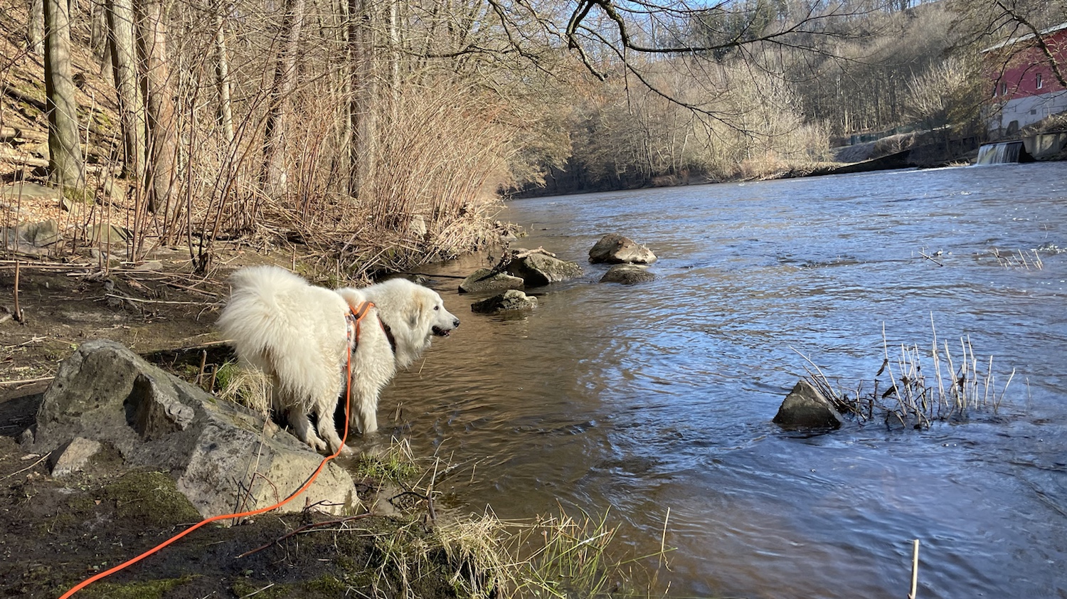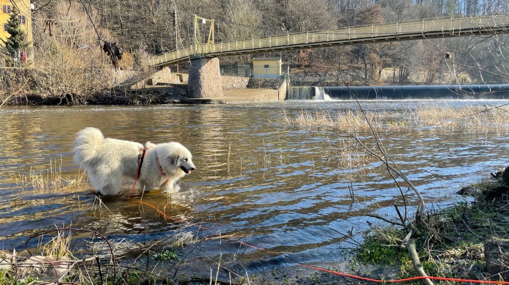 Ich bin mit meinem großen Mensch dann bis zum großen Fluß mit dem komischen Namen und an der Wackelbrücke vorbei. Da bin ich dann auch baden gegangen. In der Tschooo-Pauuu. Da waren auch Enten. Die sind aber vor mir abgehauen. Mein großer Mensch sagt, ich bin da zu wild. Bis zu meinem Pyribäuchlein bin ich im Wasser gewesen.