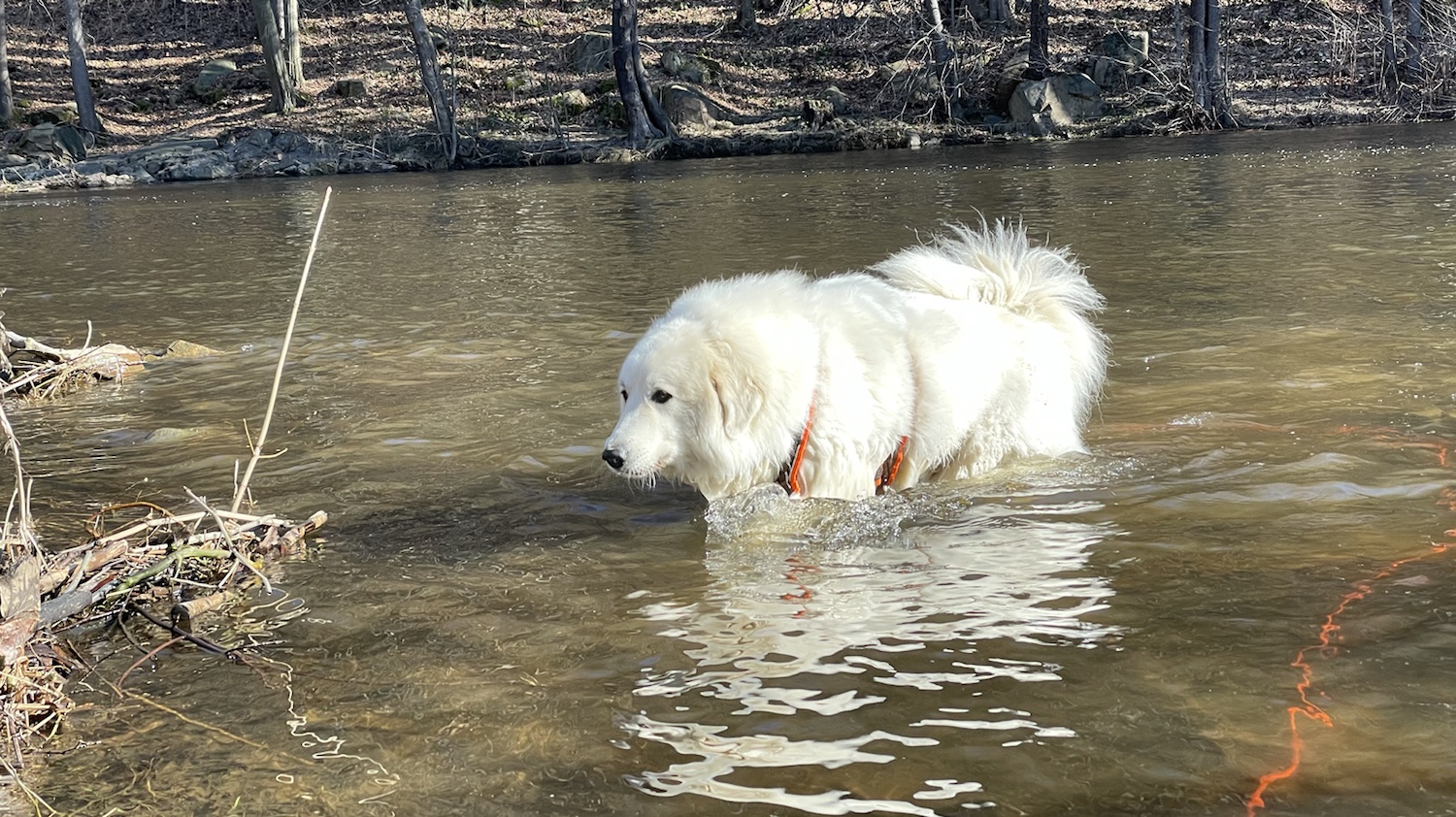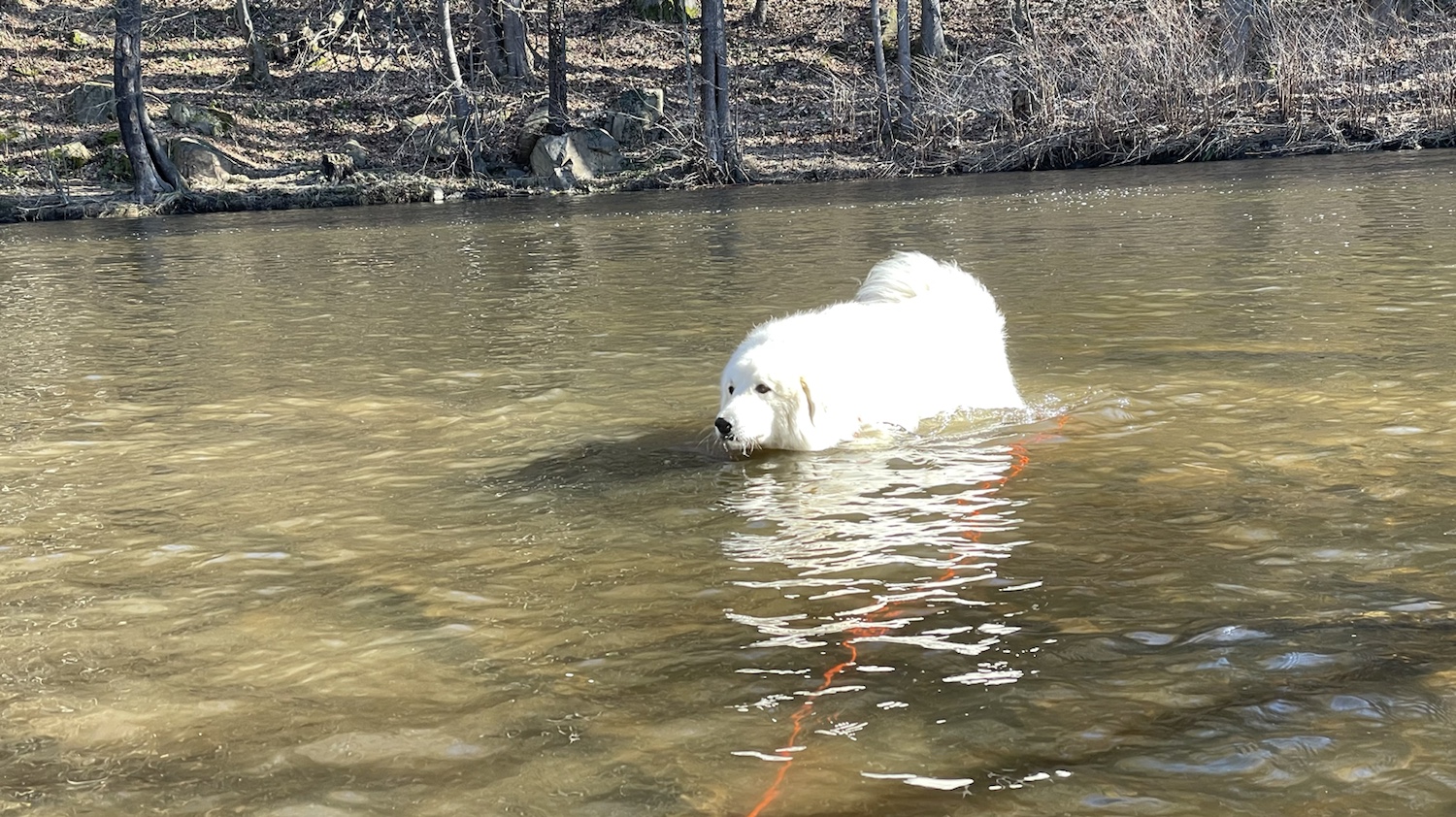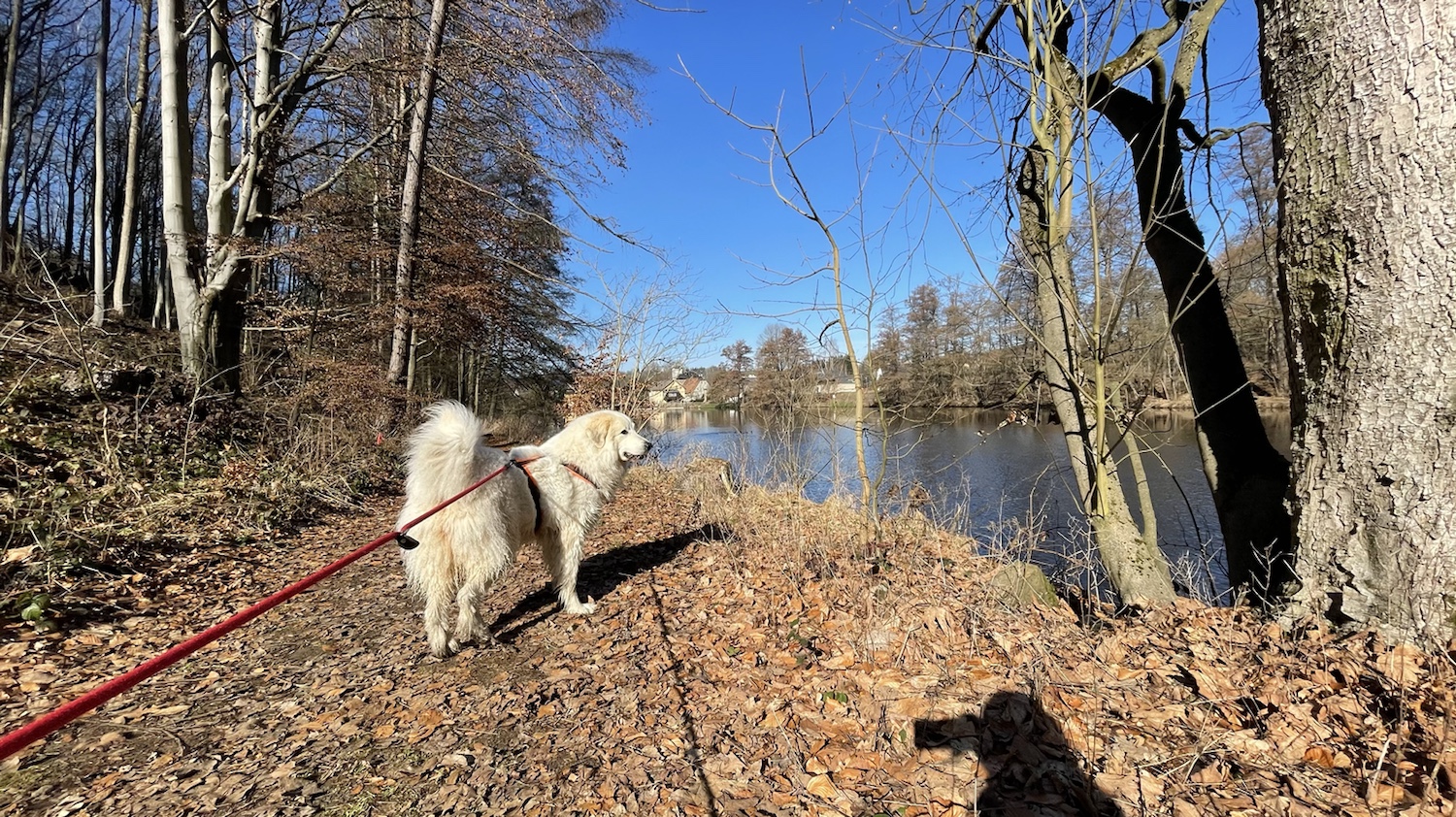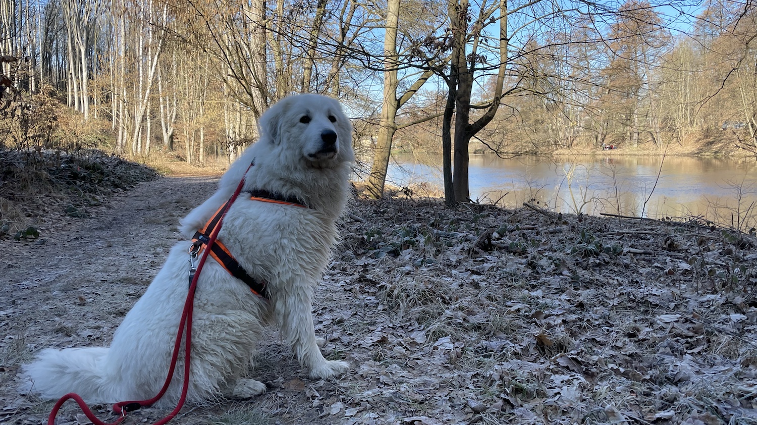 Ich bin mit meinem großen Mensch dann bis zum großen Fluß mit dem komischen Namen und an der Wackelbrücke vorbei. Da bin ich dann auch baden gegangen. In der Tschooo-Pauuu. Da waren auch Enten. Die sind aber vor mir abgehauen. Mein großer Mensch sagt, ich bin da zu wild. Bis zu meinem Pyribäuchlein bin ich im Wasser gewesen.