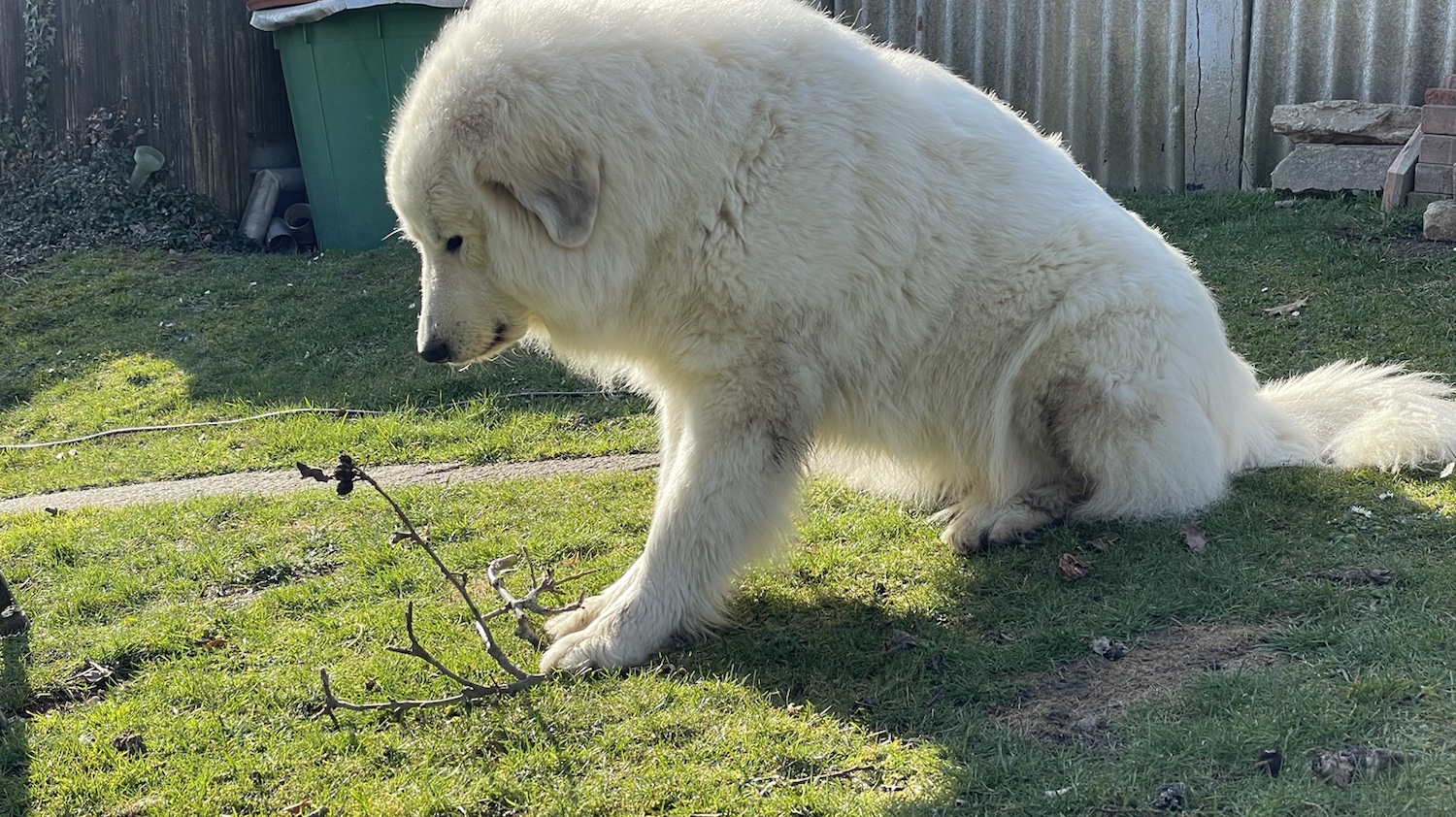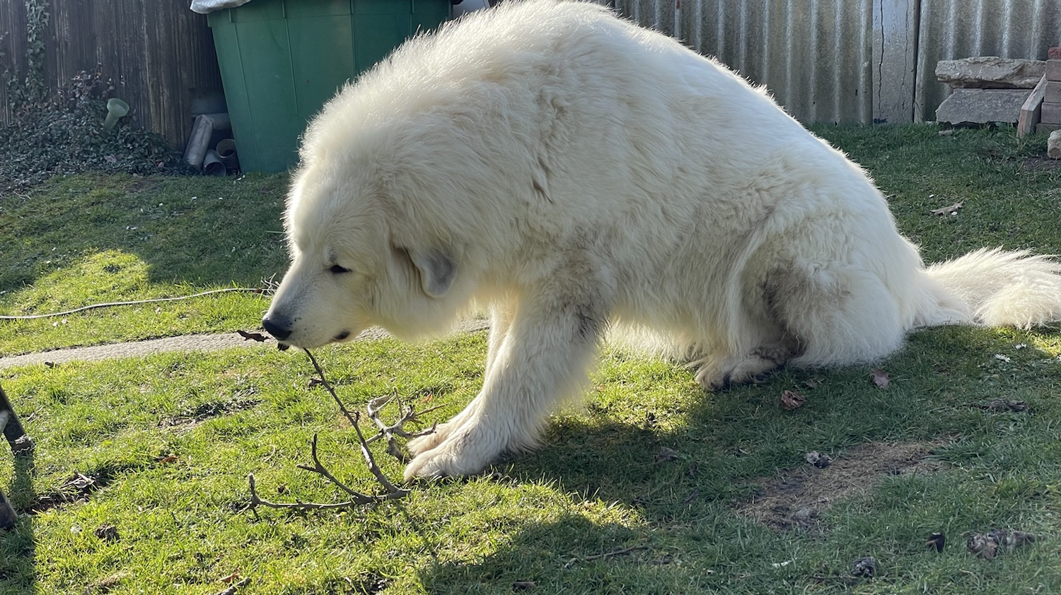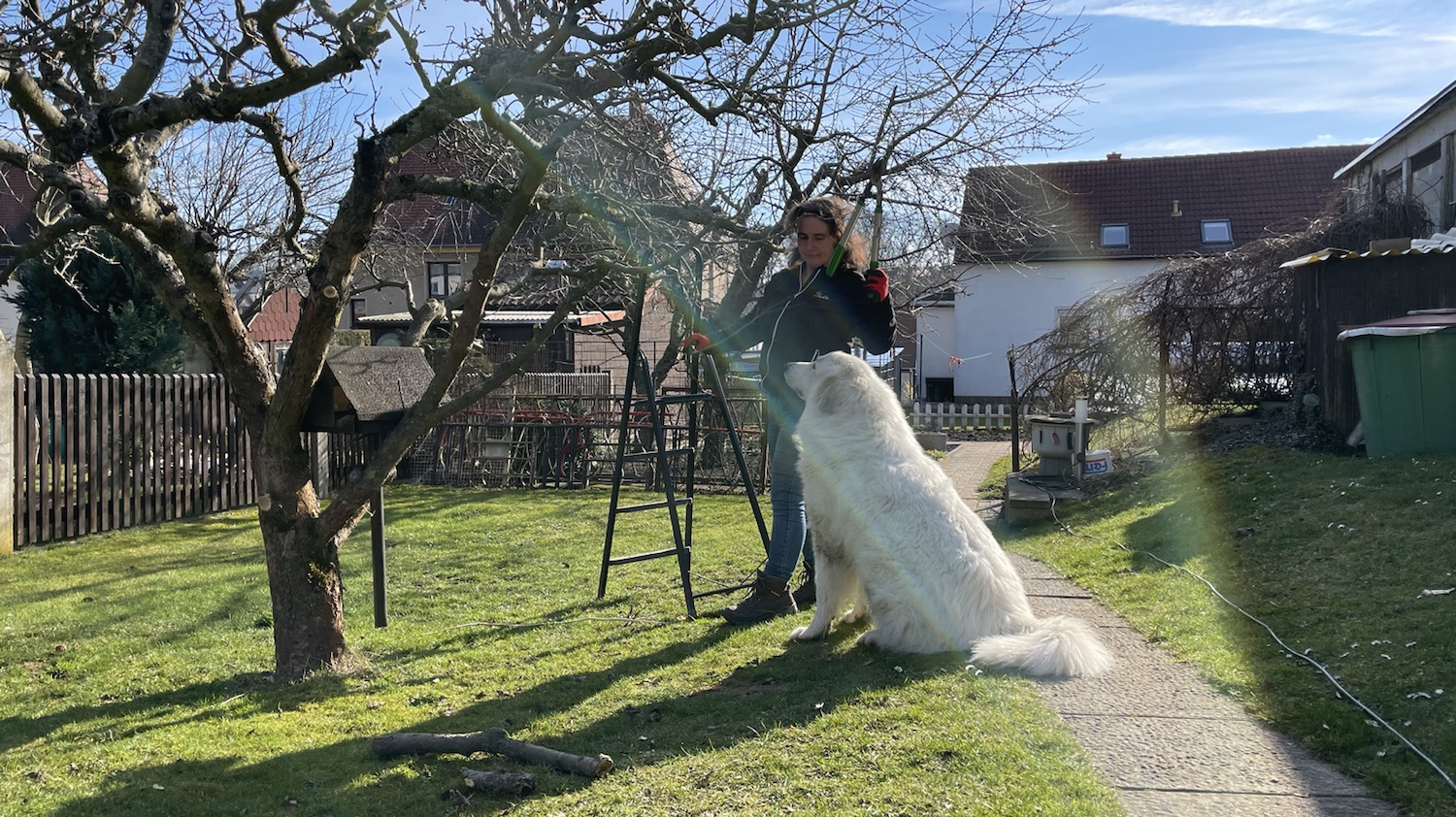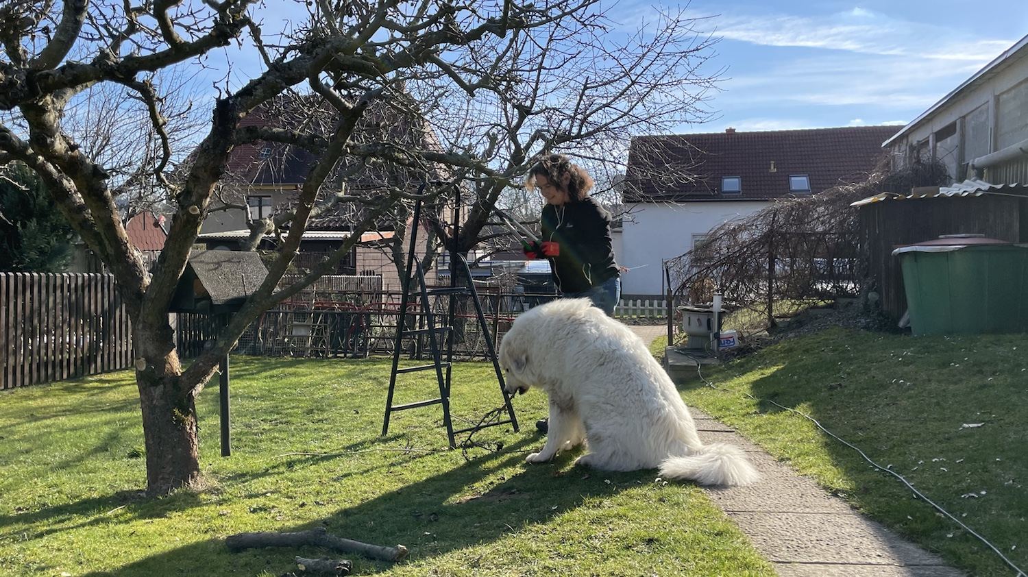 Weiiil, heute ist Sonnabend und da hat die Bella wieder schön ausgeschlummert. Wochenende! Da macht man das so. Aber dann gab es Frühstücksfutter. Mit meinem großen Mensch. In meiner Kellerwohnung. Und danach bin ich in meinen Garten gegangen.