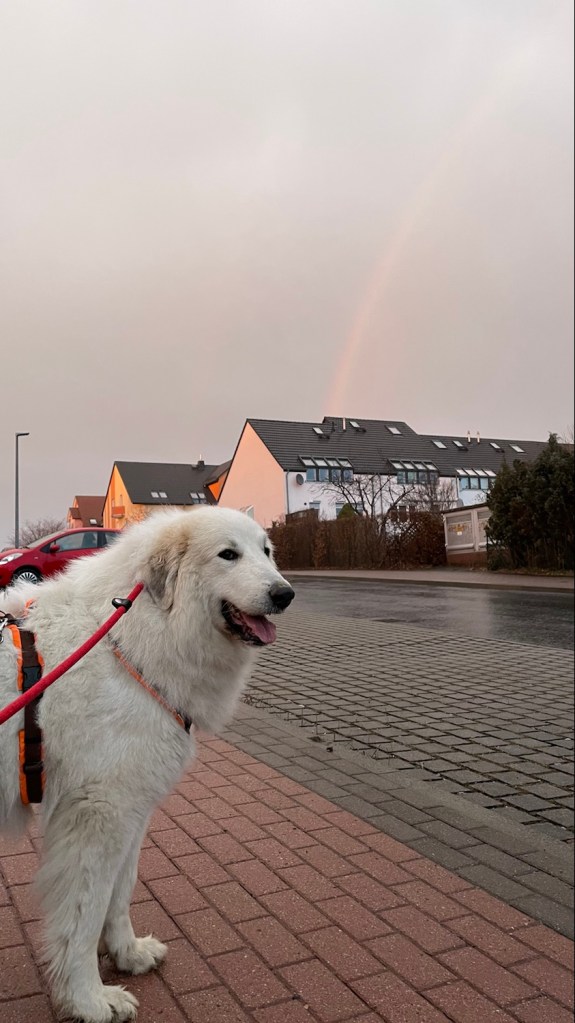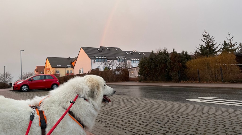Und als wir da so gekuschelt haben, kam ein schöner bunter Regenbogen am Himmel. Den kenne ich. Da wohnen mein großer Bruder Amico und meine kleine halbe Schwester Blanca und mein erster bester Freund Charlie, der Goldige Retriever. Jawoll! Die wohnen da. Hinter der Regenbogenbrücke. Und die haben bestimmt ihre liebe Bella gesehen.