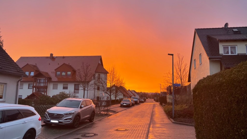 Ich habe noch ein kleines Picknick gemacht und dann sind wir zurück nach Hause gegangen. Und da war dann der Abendhimmel ganz wunderschön dunkelorangebunt. Wegen dem Sonnenuntergang. Und die Bella mag doch den Sonnenuntergang so sehr.
