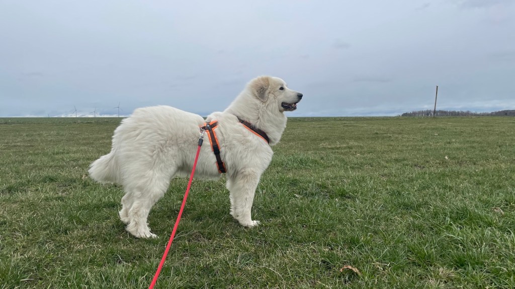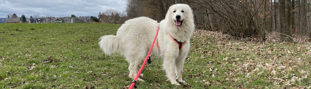 Nachmittags sind wir dann wieder spazierengeggangen. Zu meiner großen Feldwiese. Und da sind wir dann auch drübergeflitzt. Ich bin wieder ein ganzes Stück mit meinem großen Mensch gerannt. Das macht Spaß, weiiil, da flattern meine Pyrischlappohren. Und der Pustewind hat heute wieder gepustet.