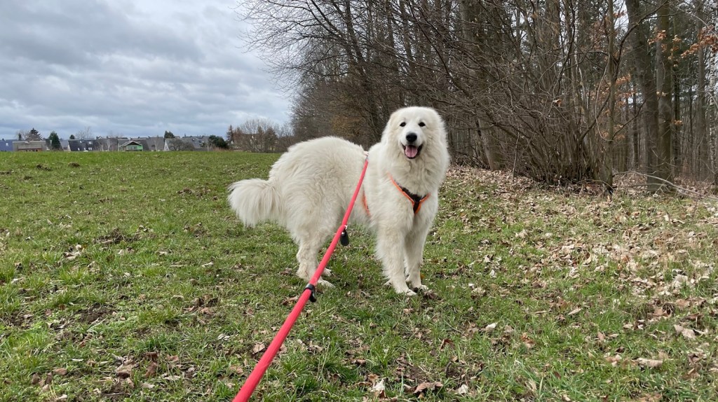 Ich bin mit meinem großen Mensch weiter am Waldrand zur Wiese. Da hat mich mein großer Mensch dann nochmal richtig gebürstet. Weiiil, meine dicke Winterpyrifellunterwolle geht ja jetzt raus aus meinem schönen champagnercremeweißfarbenen Pyrifell. Und da hilft mir mein großer Mensch. Fellwechsel strengt nämlich ganz schön sehr an.