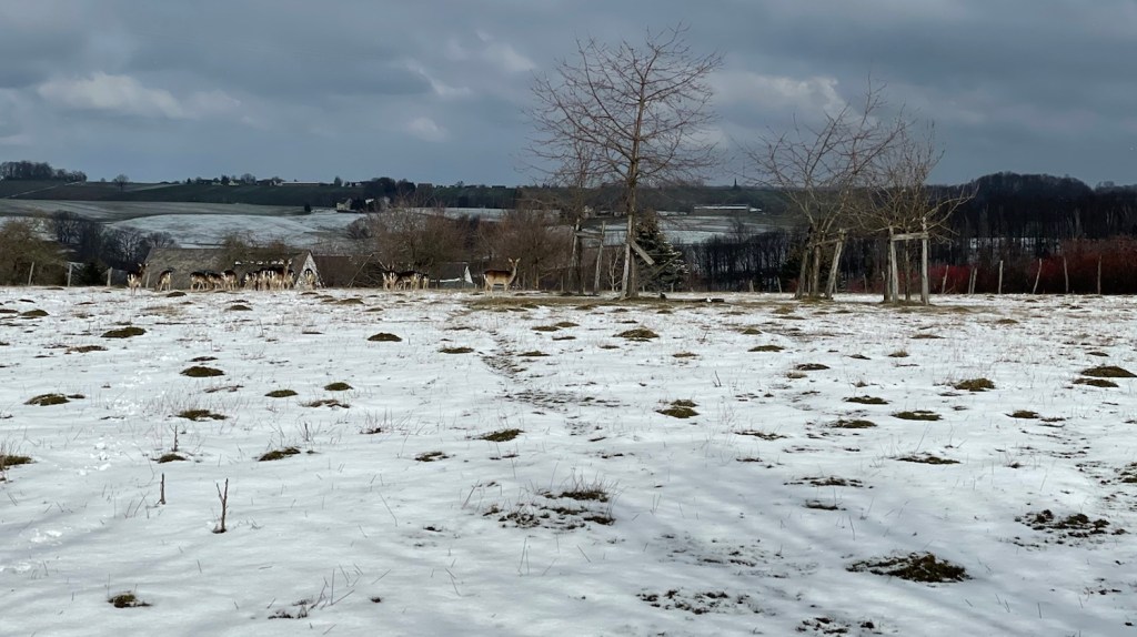 Über die ganze große Wiese sind wir dan zu den eingehegten Rehen gegangen. Und heute waren da ganz viele und ganz nahe am Zaun. Und da habe ich mit meinem großen Mensch geguckt. Und die Rehe sind gar nicht vor mir weggelaufen, weiiil, ich war ganz brav und ruhig.