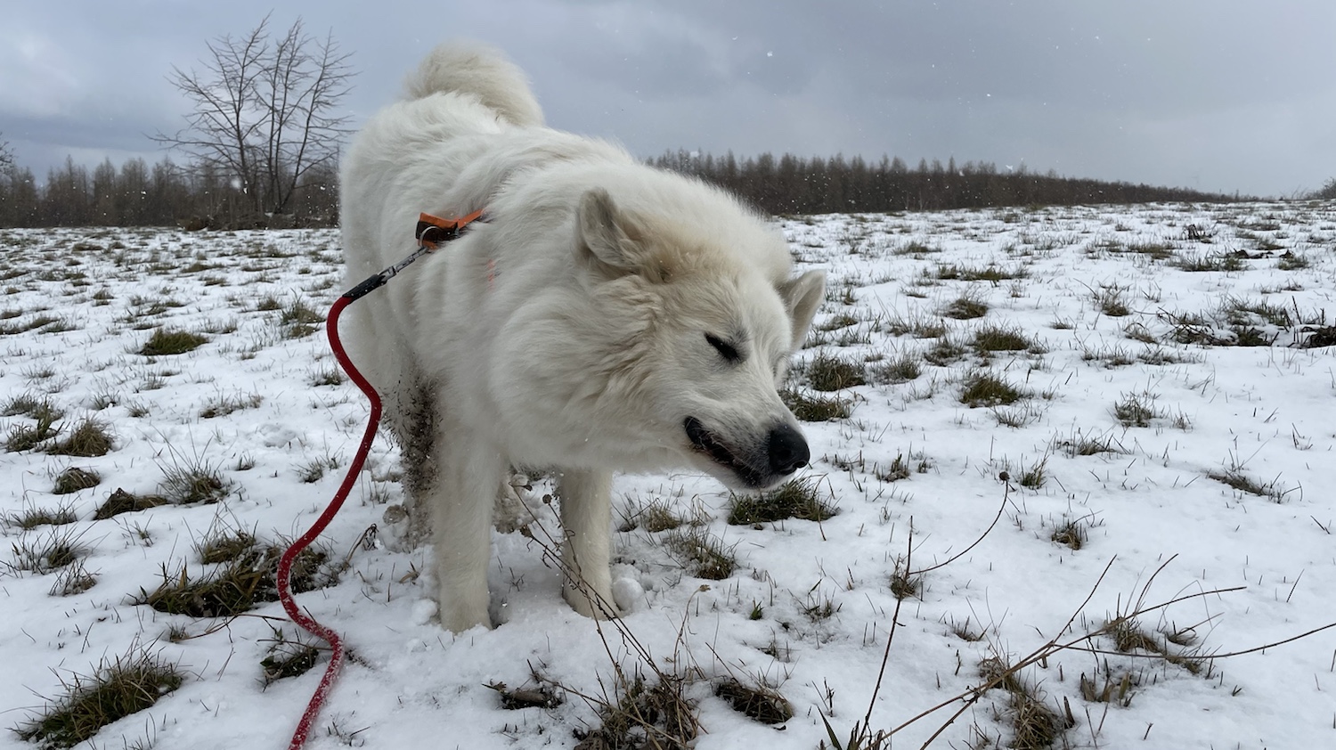 Ich bin mit meinem großen Mensch weiter am Waldrand zur Wiese gegangen. Da hatber mir dann erstmal schön mein champagnercremeweißfarbenes Pyrifell ausgebürstet. Wegen Fellwechsel. Das ist ganz anstrengend. Und dann sind wir weiter zum Haus in dem mal die Frau Dobermann gewohnt hat und noch weiter zum kleinen Parkplatz.