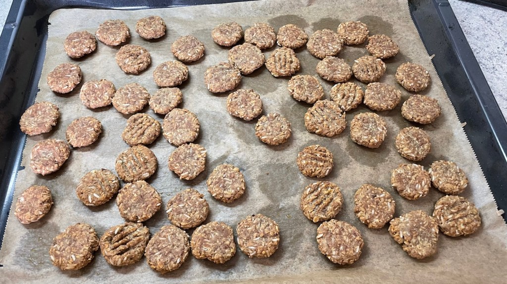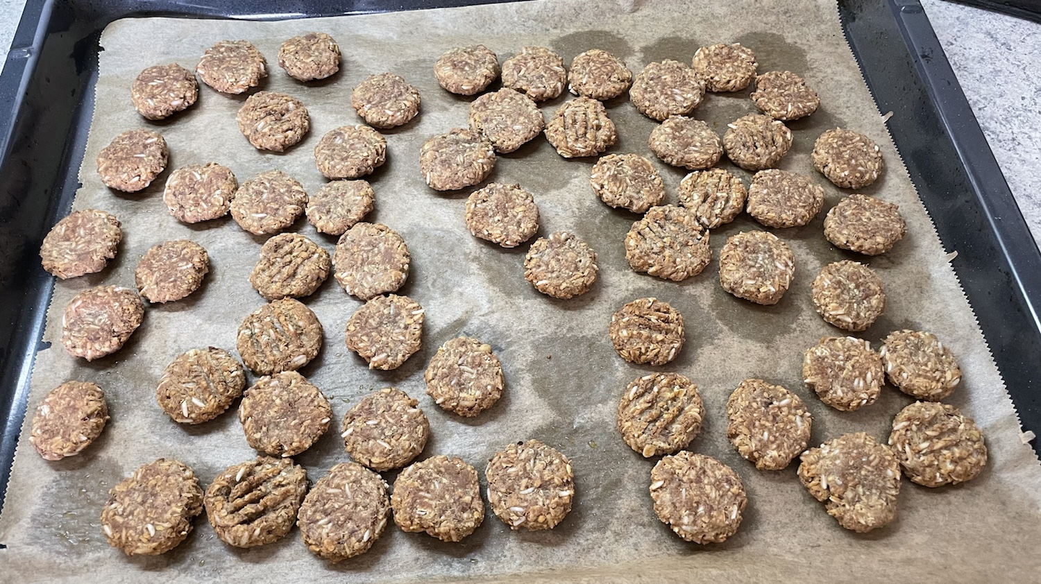 Mein großer Mensch ist jetzt ein Bäcker. Der hat nachmittags dann für seine liebe Bella leckere Plätzchen gebäckert. Ganz leckere! Und dafür hat er 200 g Gehacktes genommen. Vom Rindviehch. Und 100 g Buchweizenmehl und 50 g Reis und 50 g Haferflocken und 4 Eßlöffel Kokosraspeln. Und das muß man dann in einer Schüssel zusammenmatschen und dann schmeißt man noch zwei Eier rein. Nicht vom Rindviehch, sondern vom Huhn! Das ist wichtig. Dann macht man aus der Matschepampe kleine Kugeln und die drückt man mit einer Gabel platt und macht das ganze Zeugs in einem Backofen schön knusprig. Das dauert ungefähr 20 bis 30 Minuten. Bei ganz viel Wärme. Mein großer Mensch sagt so 160°C. Ich habe keine Ahnung, da muß ich meinem großen Mensch vertrauen. Und dann hat man ganz leckere Knusperkekse.