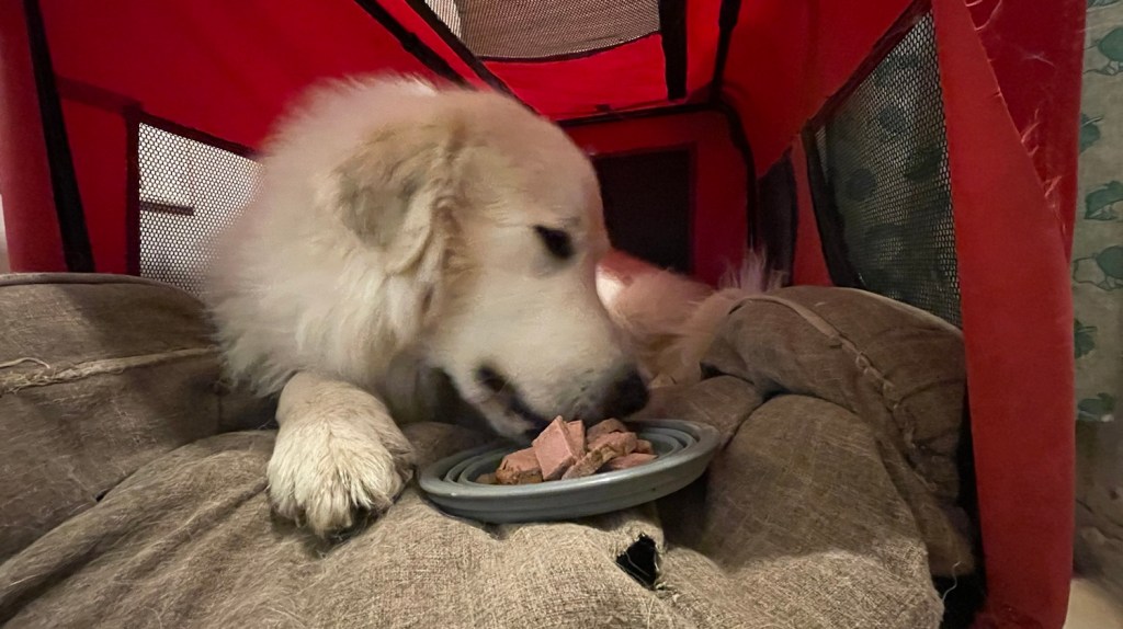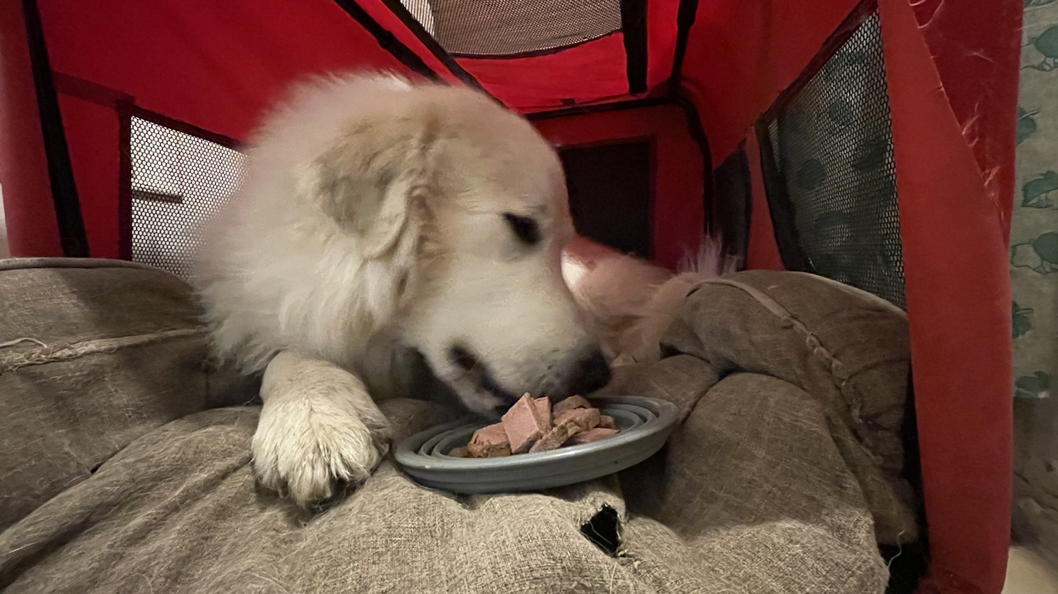 Ich habe heute früh wieder noch schön geschlummert. In meinem kleinen roten Ferienhäuschen. Mein großer Mensch hat mir mein Frühstücksfutter gemacht. Aber ich bin noch liegen geblieben. Dann habe ich aber schön gefuttert.