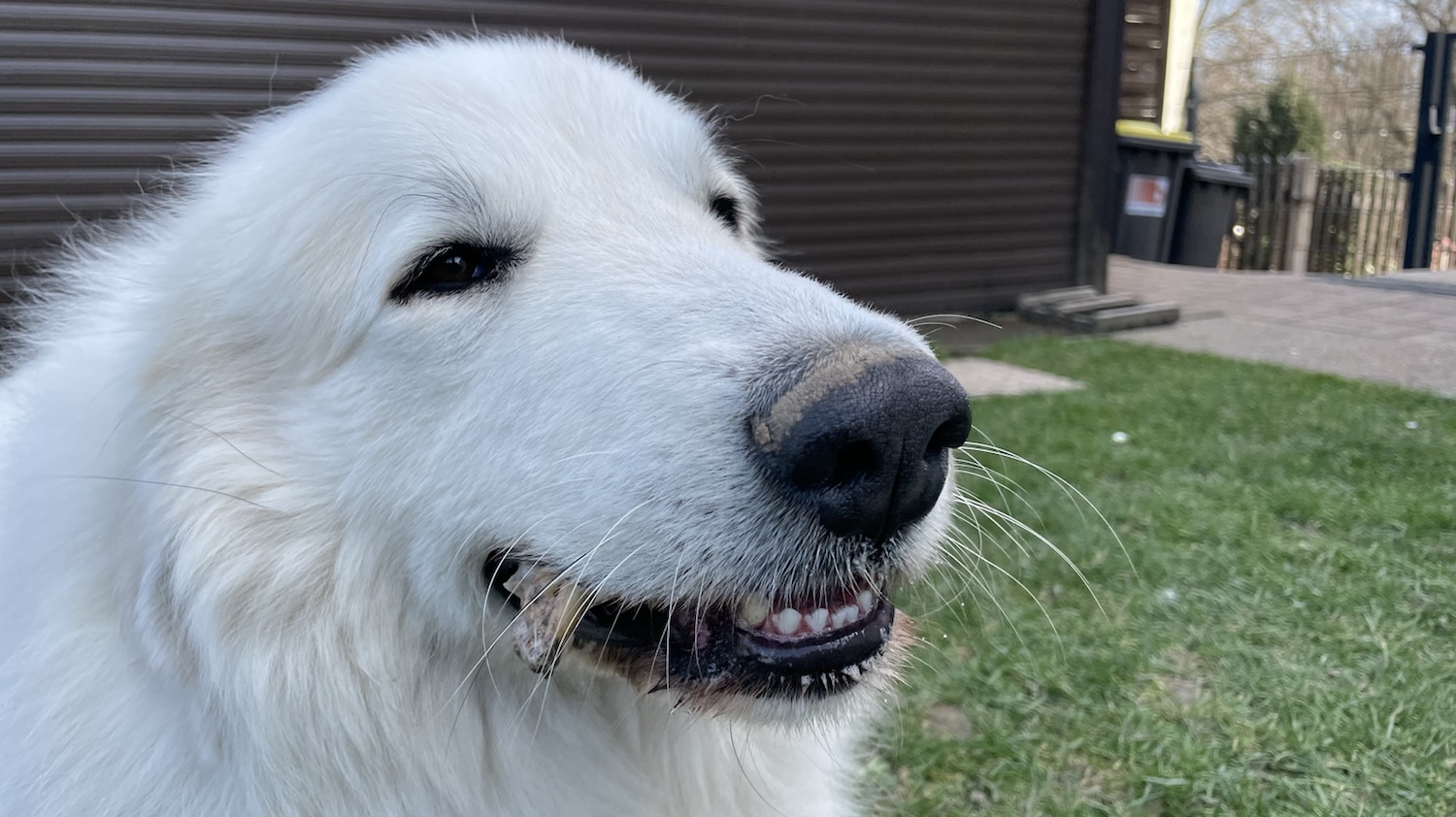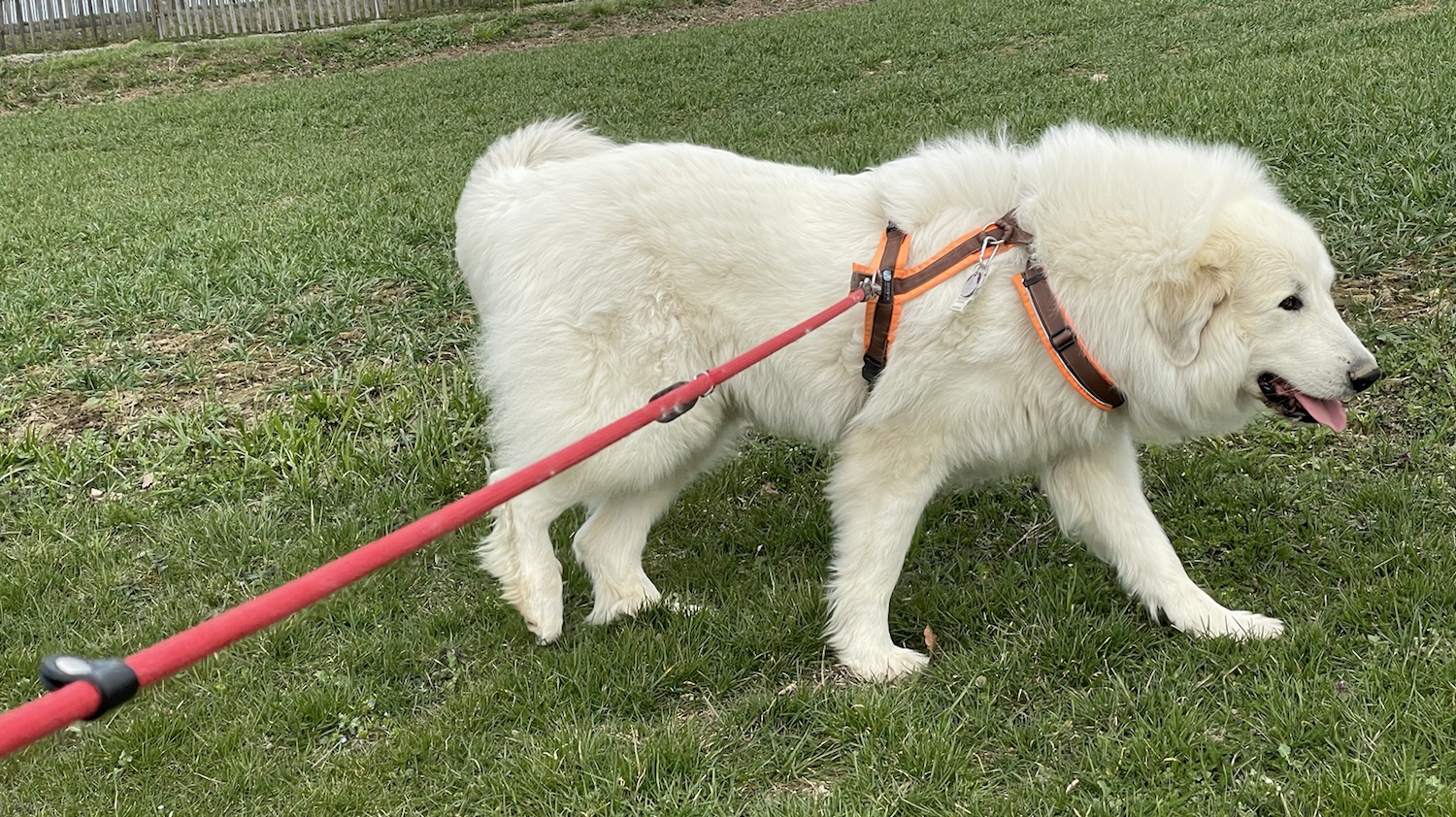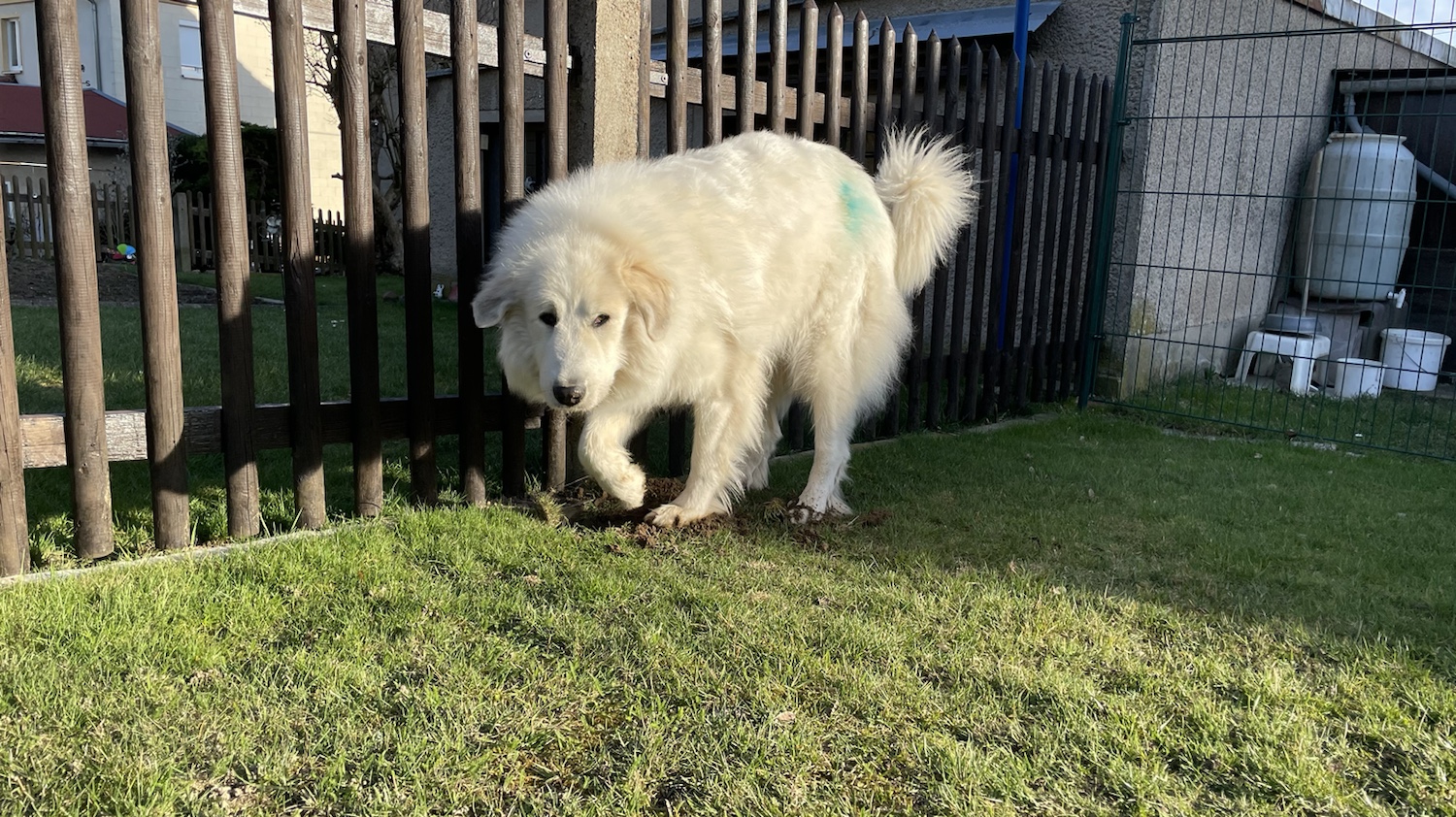 Über die Wiese auf der anderen Seite der großen Straße bin ich dann mit meinem großen Mensch nach Hause gelaufen. Da habe ich mich erstmal in meinem Garten ausgeruht. Und dann gab es Abendfutter. Zwei leckere Fleischknochen habe ich bekommen. Und eine selbst gebackene Kaustange.