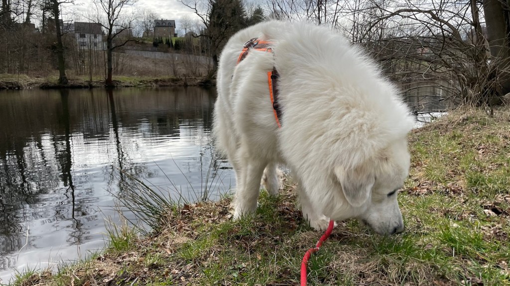 Ich bin wieder ganz brav gewesen und wir sind geschlendert, geflitzt und ich habe geschnuffelt. Heute sind nicht ganz so viele Menschen unterwegs gewesen wie gestern. Ich wollte dann noch auf die Wiese am großen Fluß mit dem komischen Namen. Und meinen großen Mensch habe ich gleich mitgenommmen.