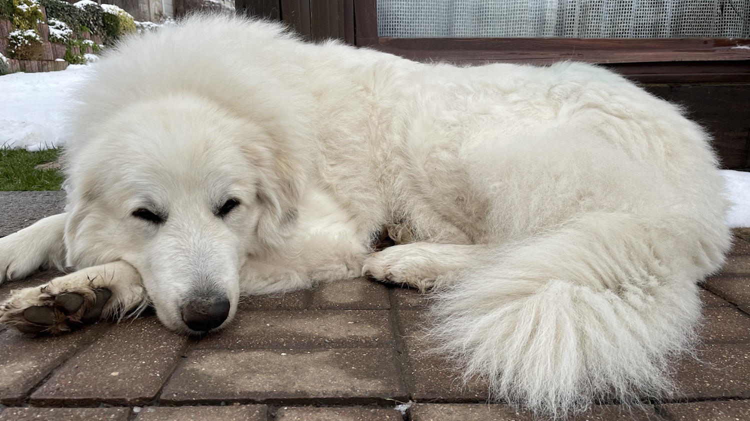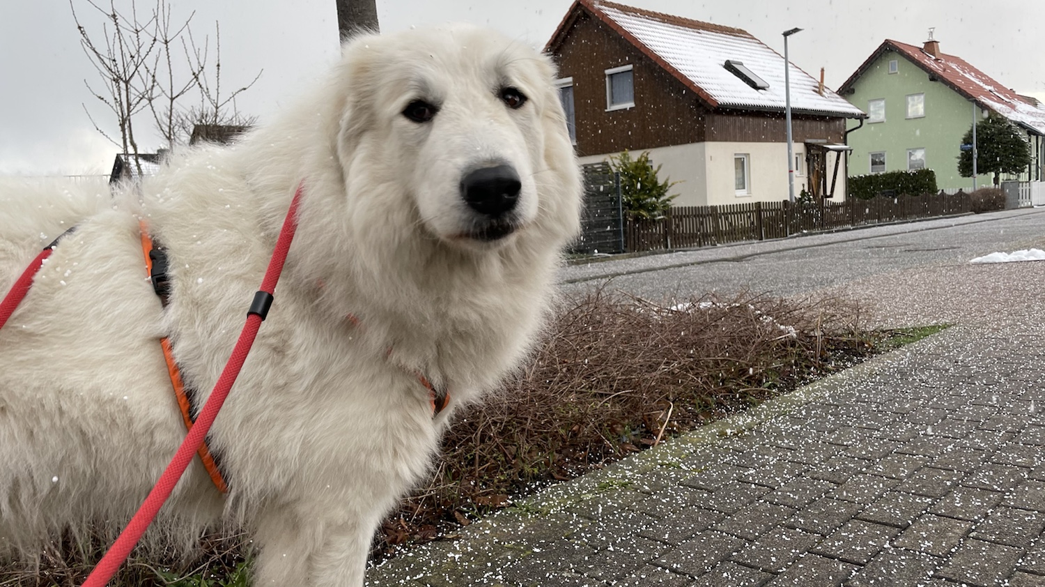 Ich bin heute wieder mit meinem großen Mensch durch mein Wohngebiet geschlendert. Gemütlich. Das war schön. Erst war schönes Wetter und dann hat es geschneet. Lauter kleine weiße Körner. Das war lustig. Aber nur kurz. Dann war es auch schon wieder vorbei.