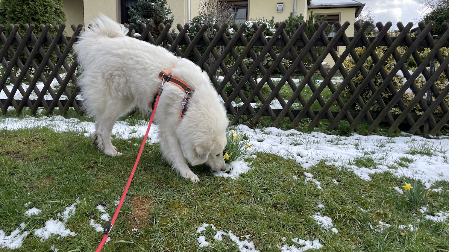 Ich habe mal wieder schön geschlummert. In der Nacht. Bis heute früh. Und da habe ich dann gefrühstücksfuttert. Mit meinem großen Mensch. Der macht mir immer mein Frühstücksfutter, frühmorgens. Danach habe ich wieder schön geschlummert, bis mich mein Menschenopi in meinen Garten gelassen hat.