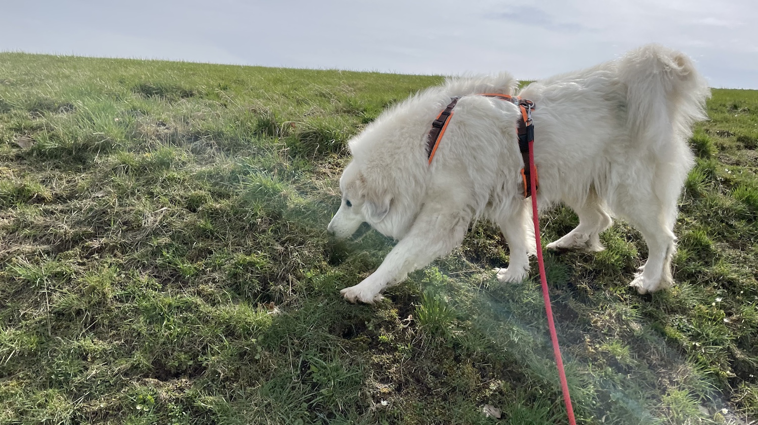 Mein großer Mensch ist zeitig nach Hause gekommen. Und da haben wir dann gleich einen Spaziergang gemacht. Zu Fuß! Zum großen Feldweg. Und vorbei an meiner großen Feldwiese. Bis nach Kockisch.