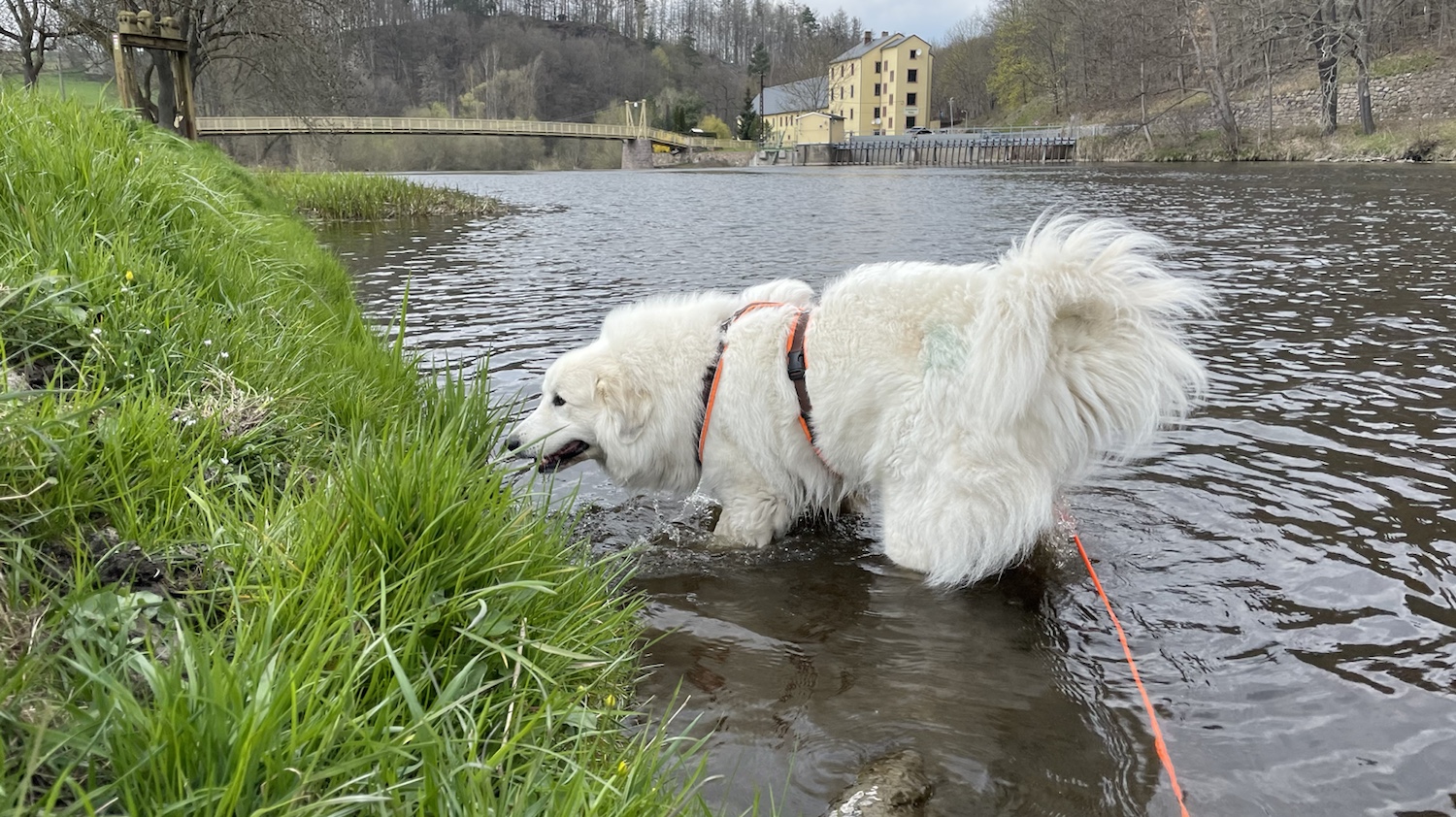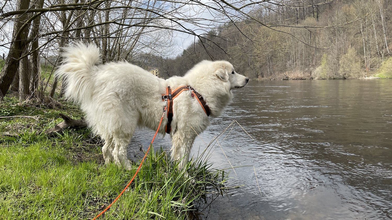 Da bin ich dann beim Kalle gewesen. Der war in seinem Garten und mal wieder ganz aufgeregt, weiiil, seine Bella war ja plötzlich da. Die Bella, das bin ich. Und wir haben uns am Zaun angeschnuffelt. Ich bin dann aber mit meinem großen Mensch an die Tschooo-Pauuu gegangen. Das ist der große Fluß mit dem komischen Namen.