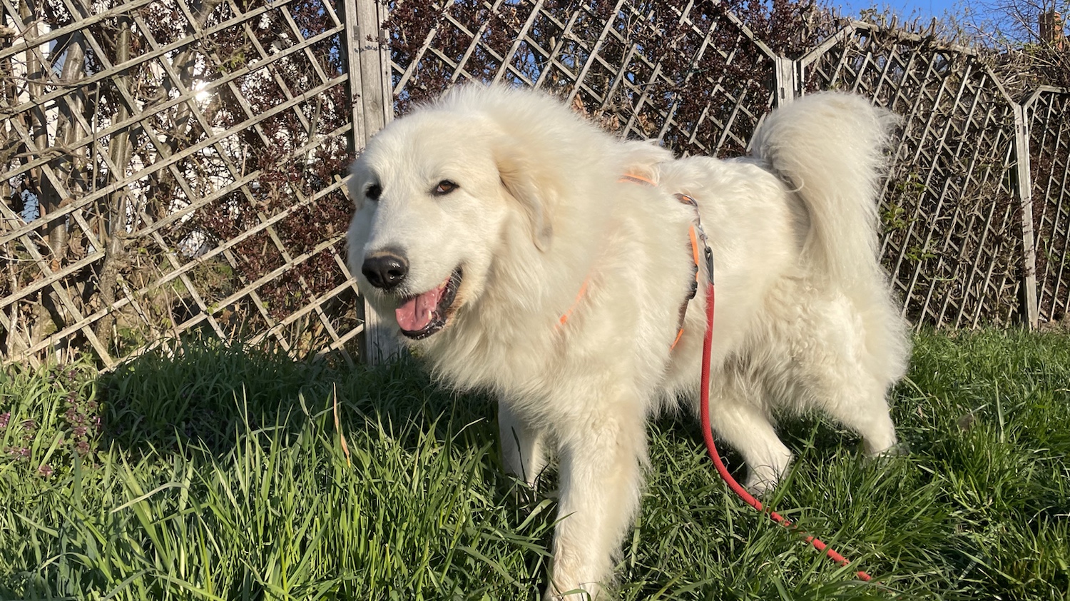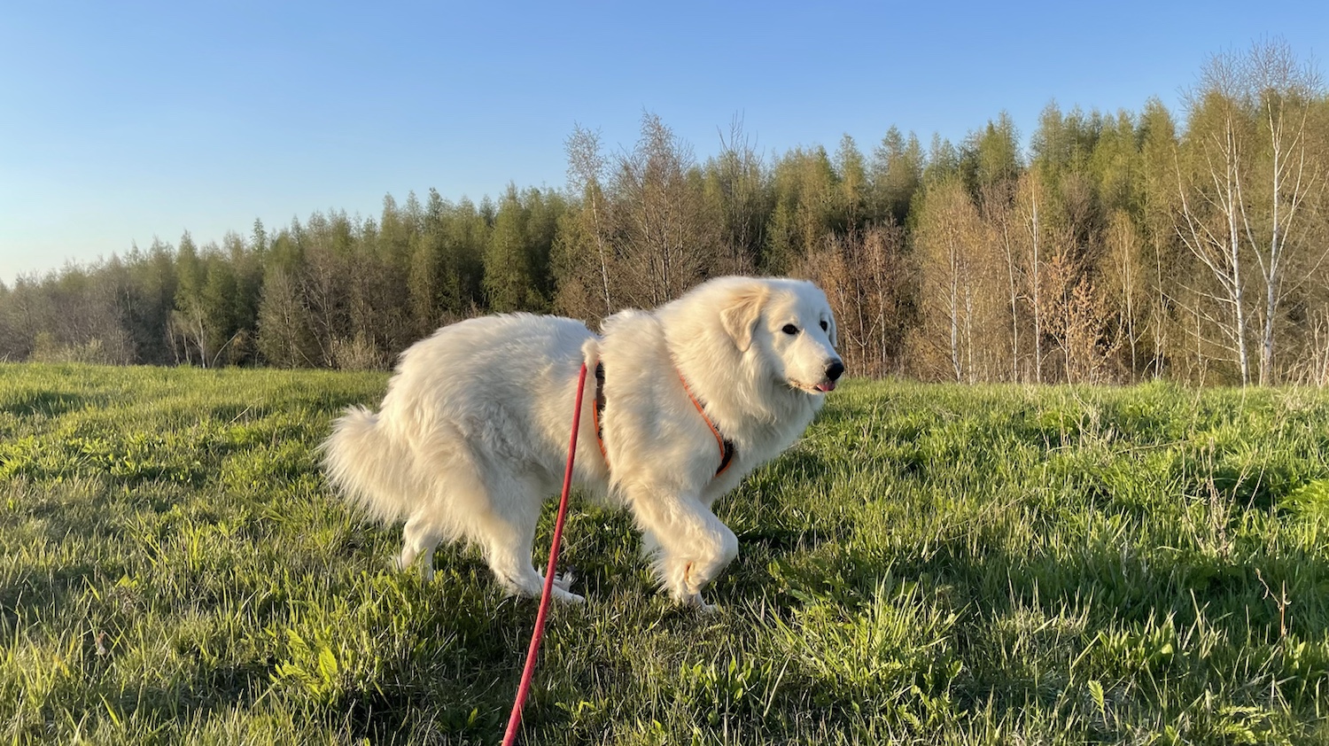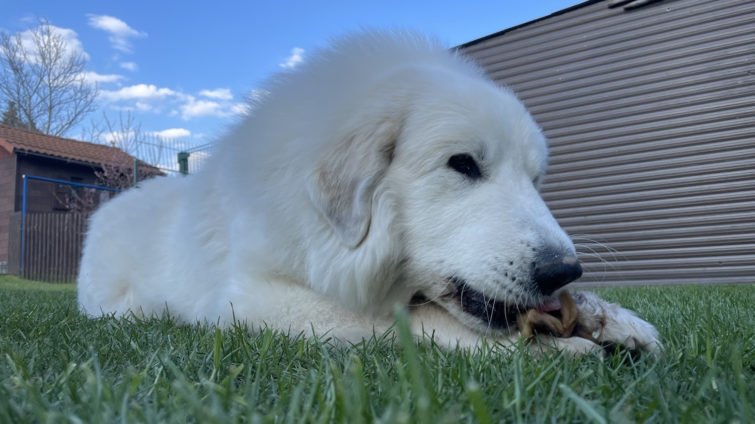 Mein großer Mensch ist heute auch wieder spät von seiner Arbeit nach Hause gekommen. Da gab es gleich Abendfutter und als wir dann abendspazierengehen wollten habe ich wieder erstmal meine Rindviehcherkopfhaut gekaut. Auf meiner Wiese. Da mußte mein großer Mensch wieder warten.
