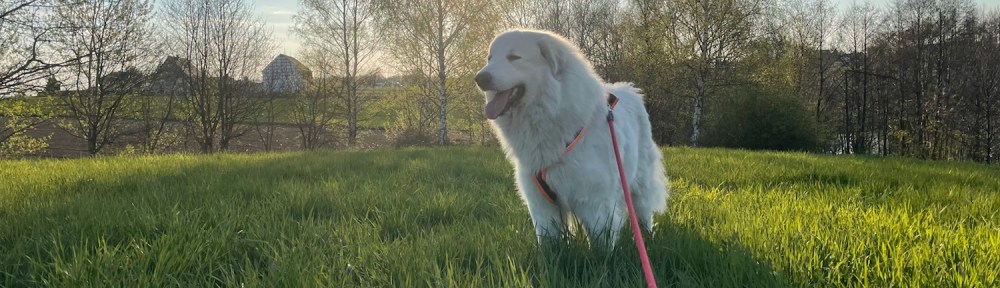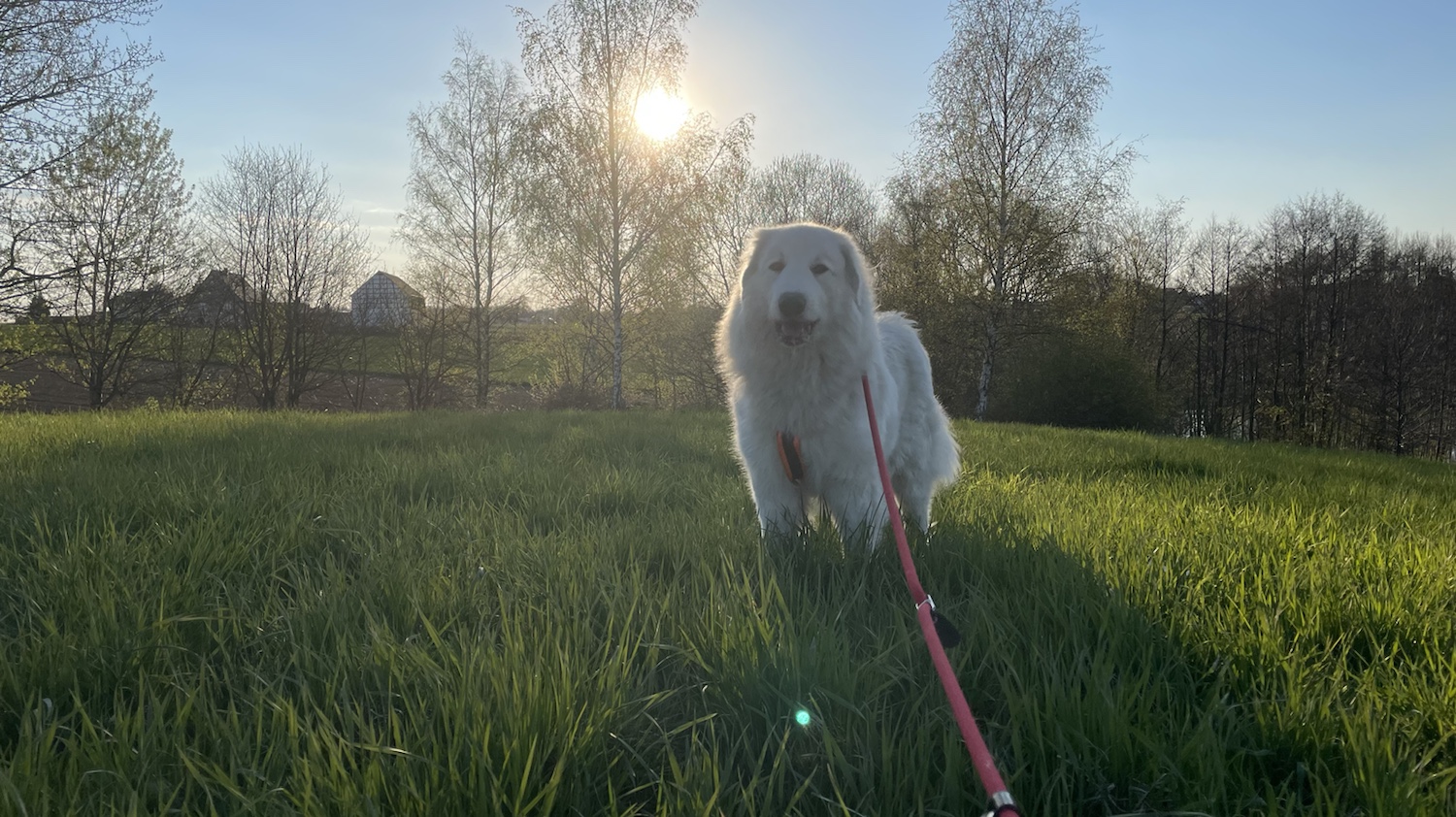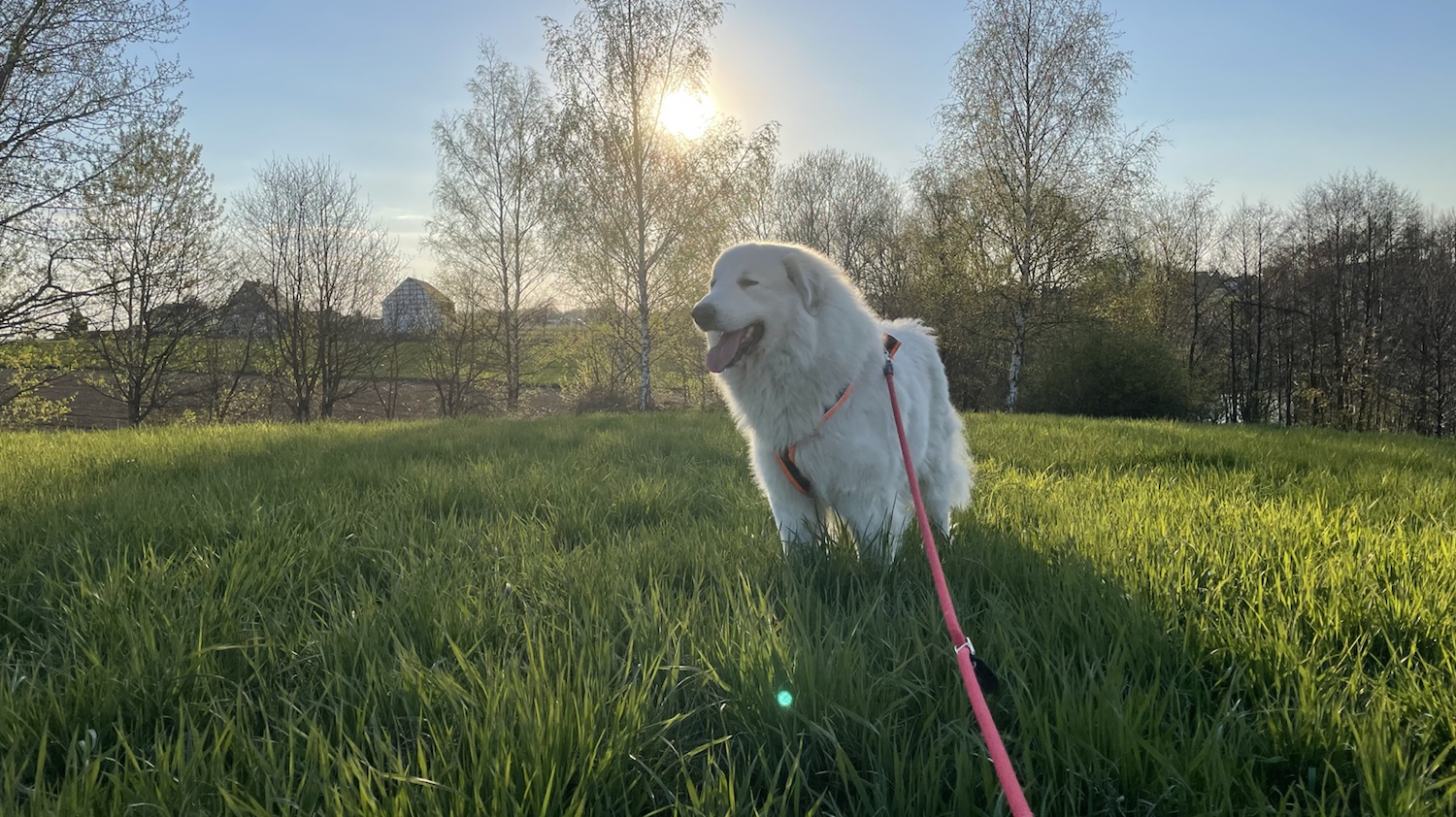 Wir sind dann eine schöne große Runde über die große Wiese gegangen. Da bin ich geflitzt und habe geschnuffelt. Und meine liebe Sonne war auch mit und ich habe Sonnenuntergang geguckt. Das mag ich doch so sehr.