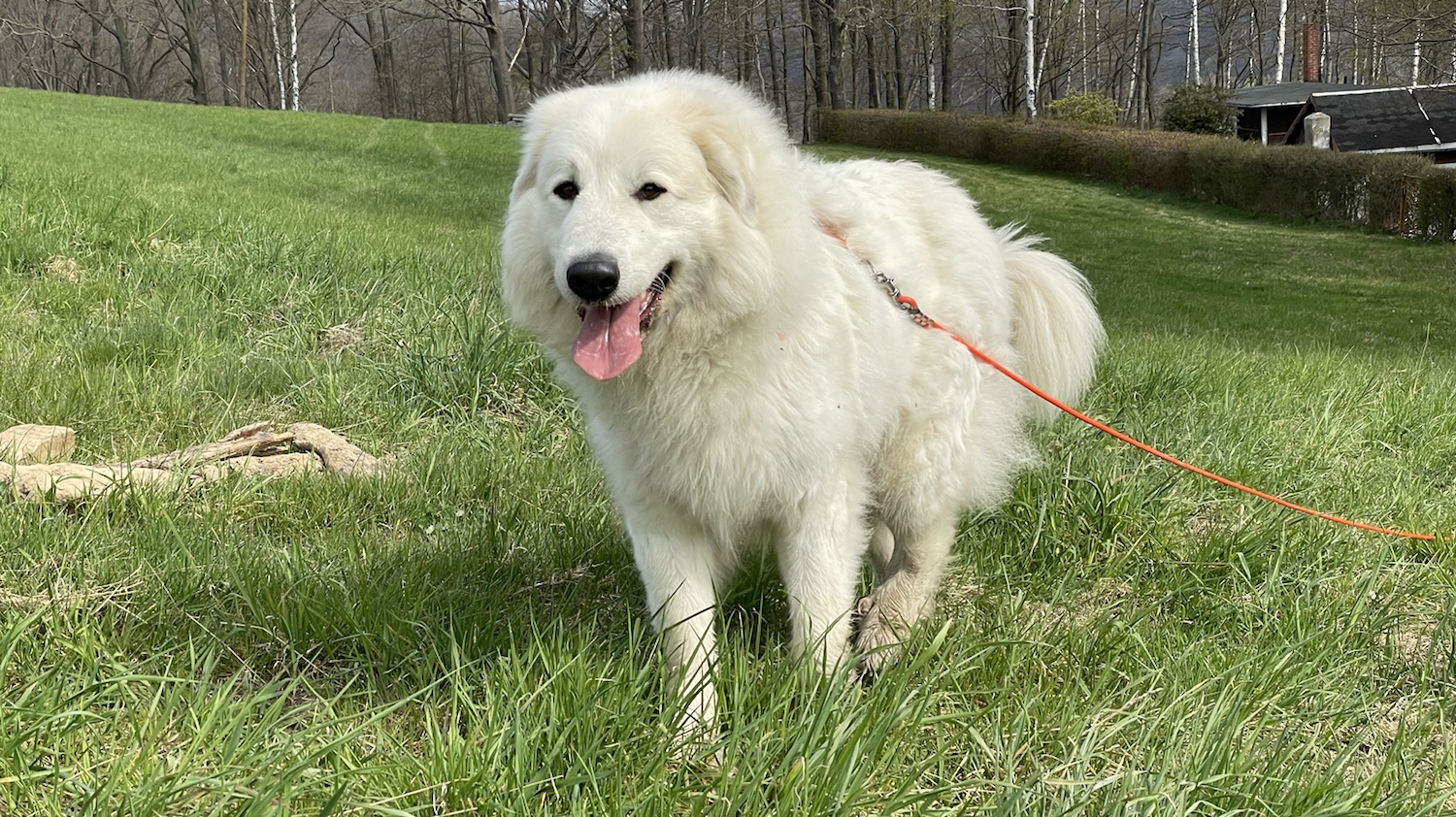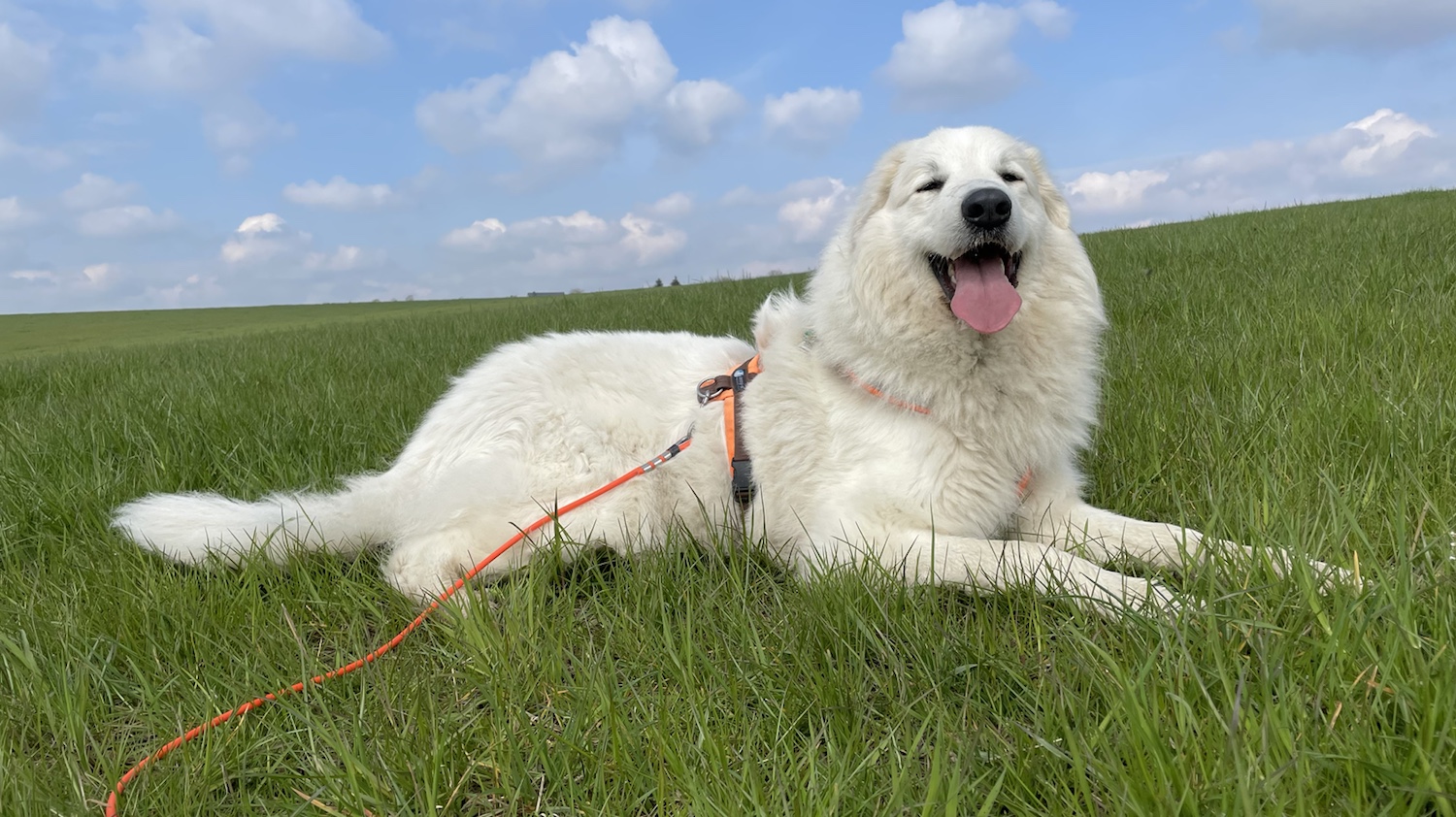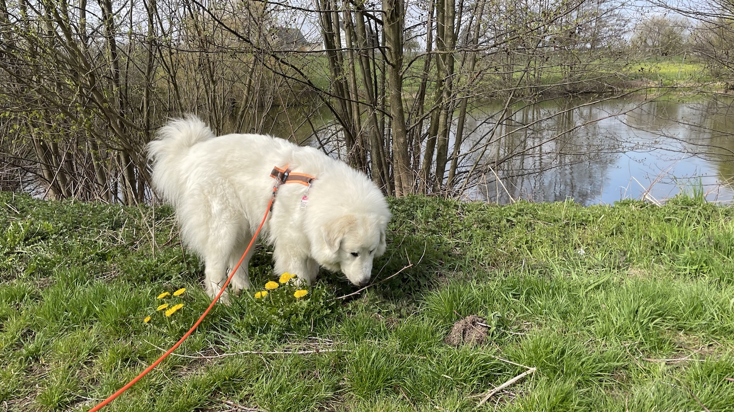 Dann sind meine Menschenschwestern zu mir gekommen und haben mich begrüßt und danach bin ich mit meinem großen Mensch losgewandert. Zuerst durch mein Wohngebiet. Und dann gleich zur großen Wiese hinter meinem Wohngebiet. Da war dann Umleinen. Ich habe meine lange orangene Feldleine bekommen. Und da konnte ich gemütlich überall schnuffeln.