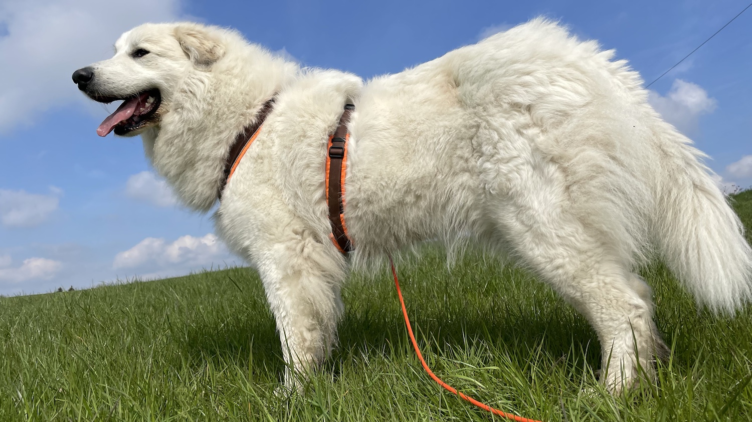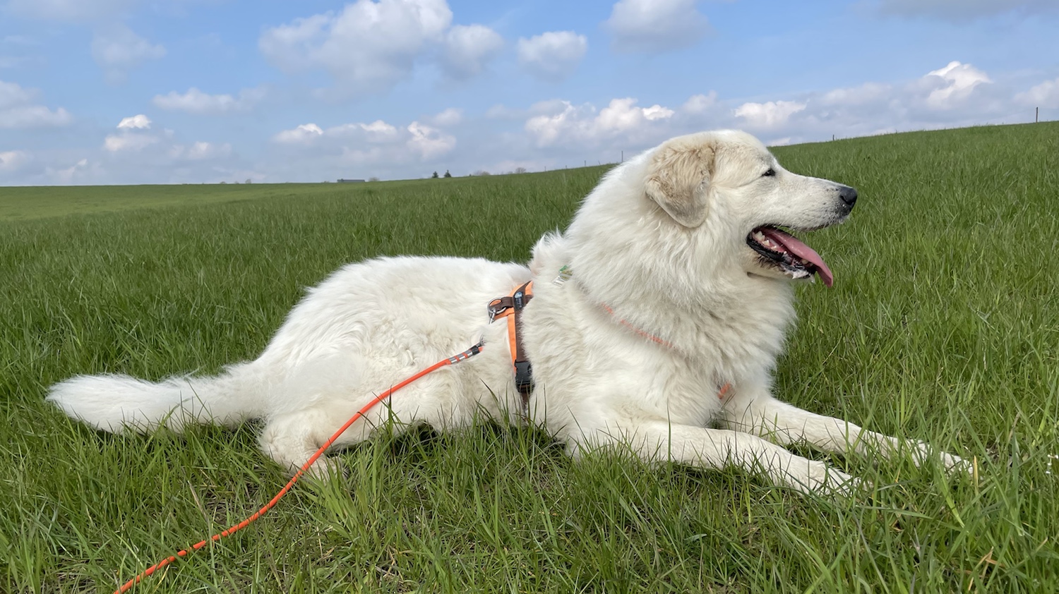 Und dann sind wir zusammen auf die großen Wiesen. Und da bin ich geflitzt. Ein Stück. Quer drüber, über die Wiese. Und mein großer Mensch ist hinterhergeflitzt. Muß er ja. Er hing ja am anderen Ende von meiner schönen langen orangenen Feldleine.