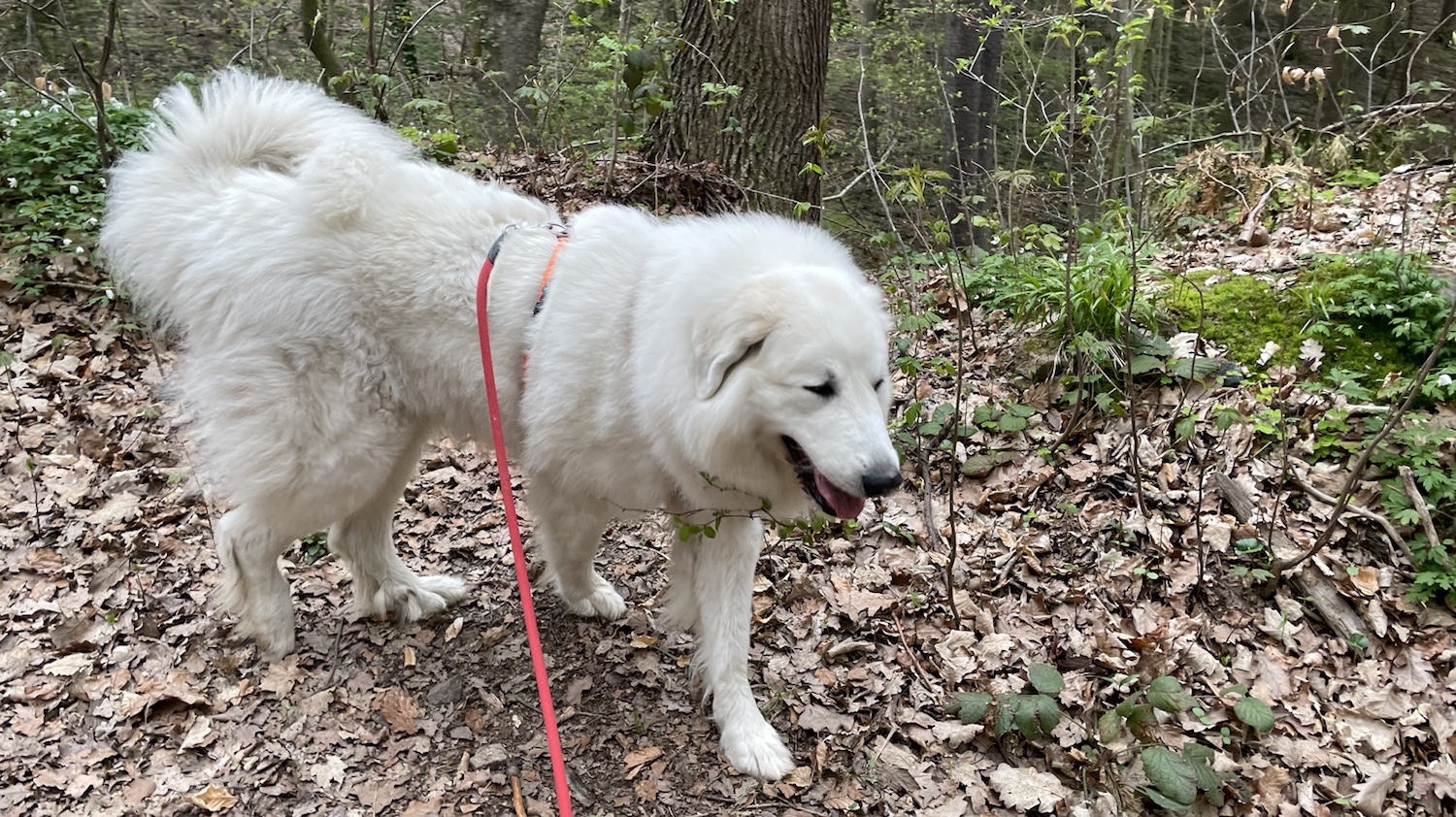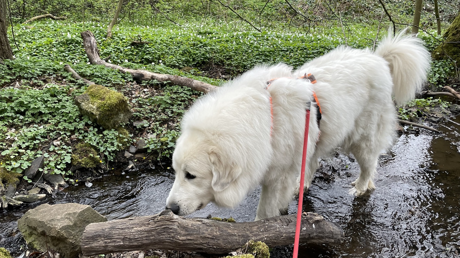 Wir sind dann im Wald zum kleinen Bächlein gegangen und ich habe da was getrunken. Dann ging es weiter am Skihang vorbei. Ich wollte den Skihang hoch, aber mein großer Mensch wollte unbedingt durch den Wald wieder zurück. Da sind wir dann eben durch den Wald gegangen.