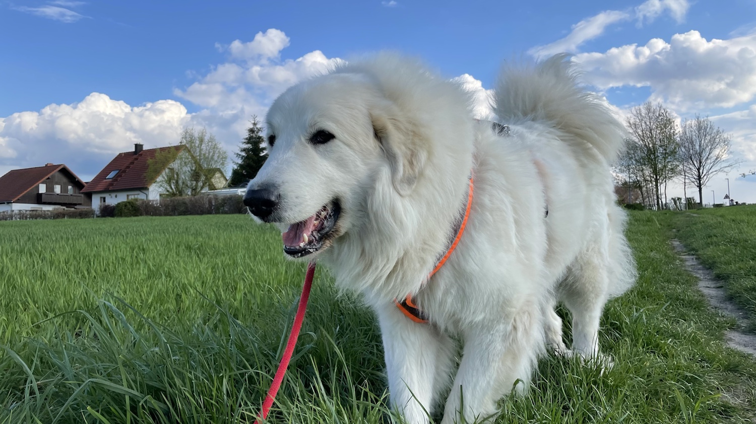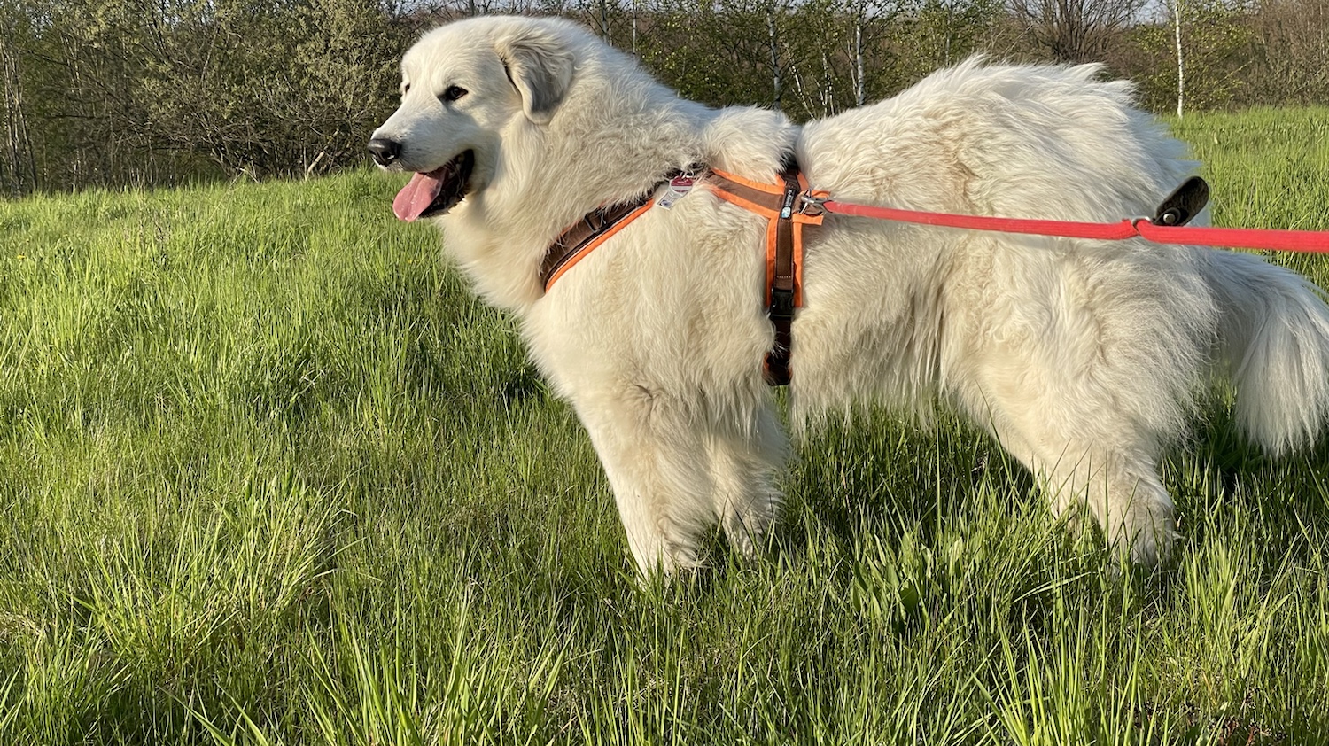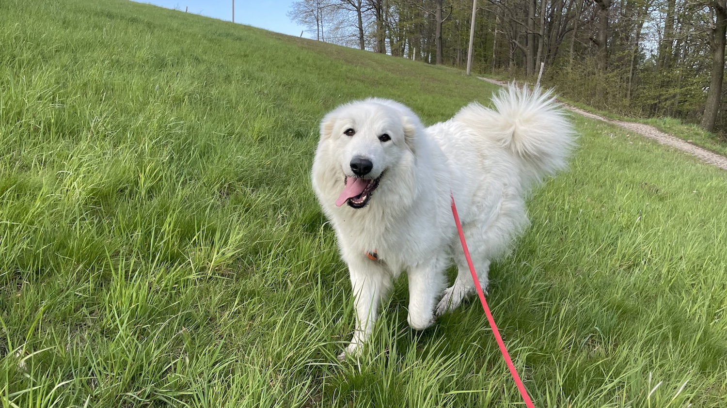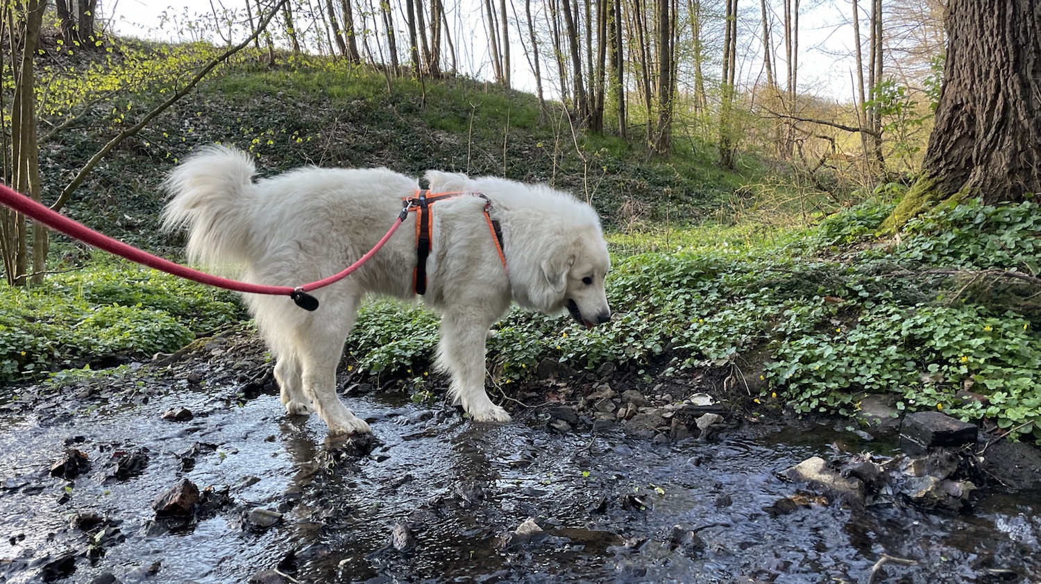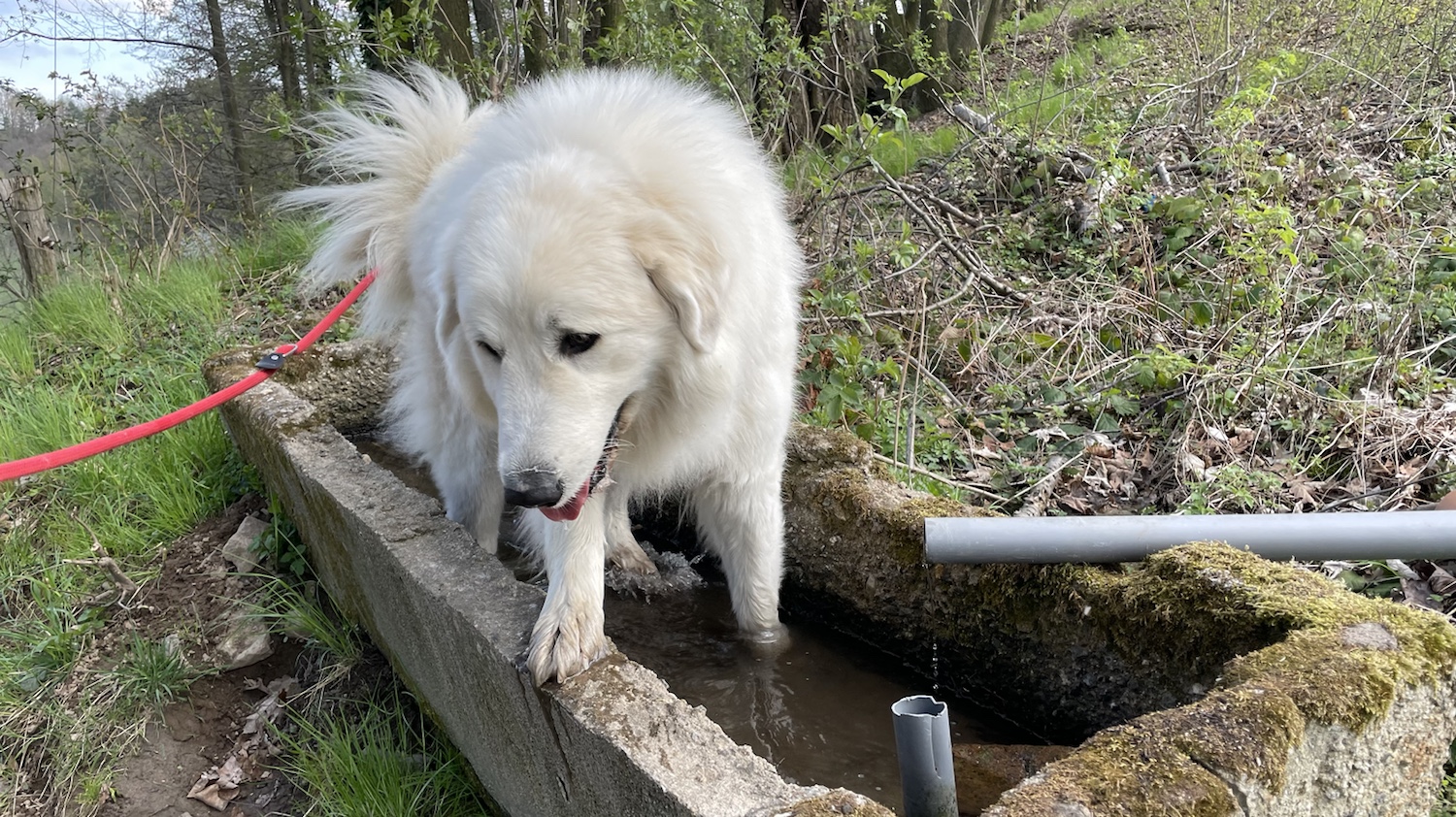 Deshalb sind wir zur Fuchsfarm gelaufen. Und ich habe auf der Wiese Gras geknabbert. Mein großer Mensch hat mich wieder Schäfchen genannt. Aber ich bin trotzdem eine Pyrenäenberghündin, eine Pyri. Gleich nach Der Fuchsfarm habe ich wieder im Wassernapf getrunken und meine Pyripfötchen gekühlt.