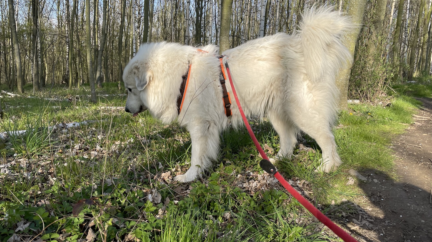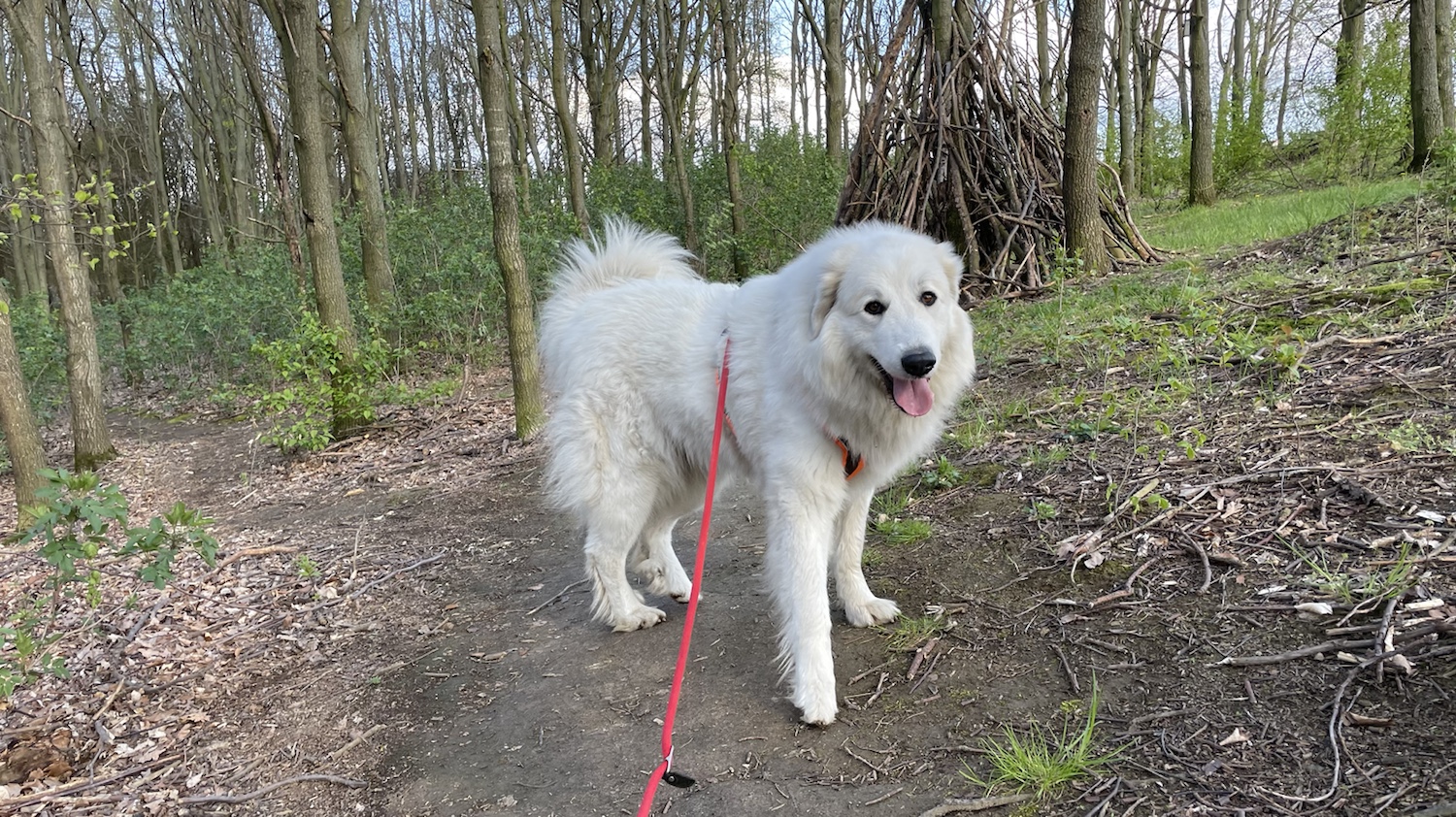 Dann sind wir den steilen Hang die Wiese hoch und zum Skihang gelaufen. Und ich habe einen Schäferhund gesehen. Der ist in das kleine Wäldchen rein. Am Skihang ist er dann auf dem Waldweg vor uns gelaufen.