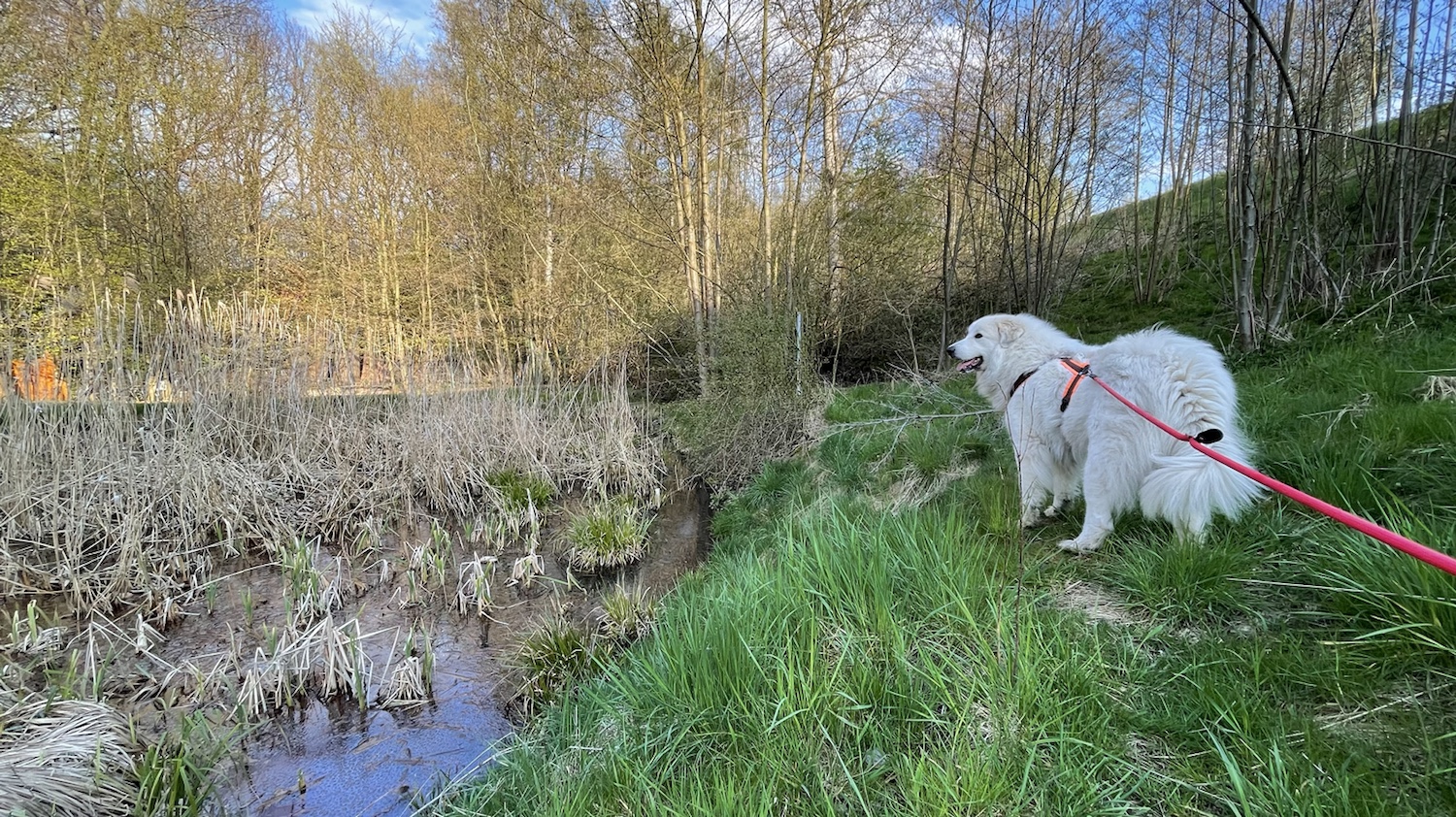 Ich bin mit meinem großen Mensch zum Teich und noch weiter um die kleine Wiese zu einem kleinen Tümpel gegangen. Dort sind wir dann wieder den Hang hochgeflitzt. Ich bin ganz schnell. Und da sind wir dann auf der kleinen Wiese gewesen. Die Rehe habe ich heute aber nicht gesehen.