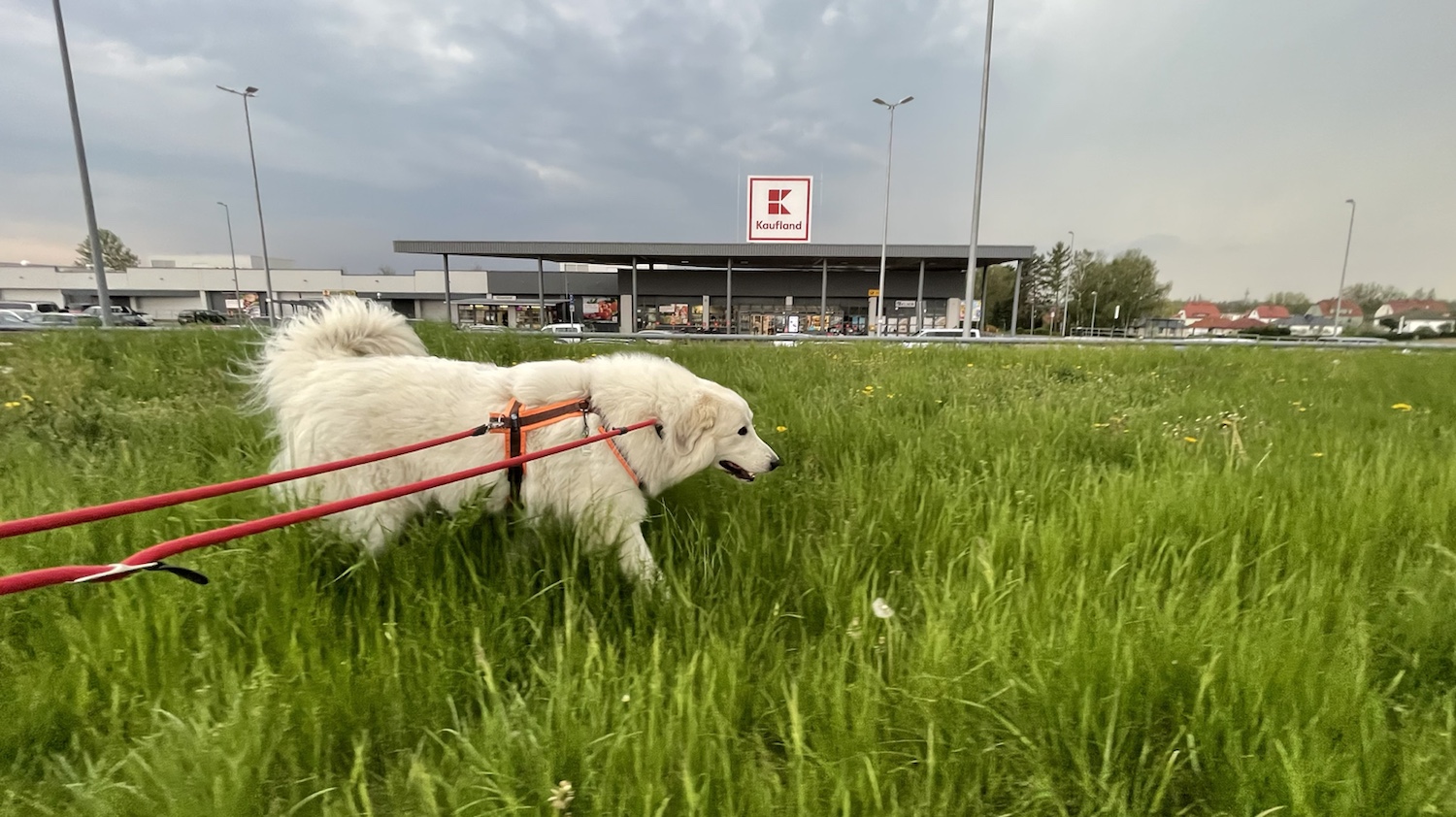 Dann sind wir noch am großen Baumarkt vorbei. Der hat aber auch geschlossen. Und außen am Baumarkt ist alles weggeräumt. Da hatte die Bella ganz viel Platz zum Schnuffeln. Ich bin schnuffelnd mit meinem großen Mensch zurück zum Parkplatz gelaufen, weiiil, es kamen ganz finstere Gewitterwolken auf uns zu.