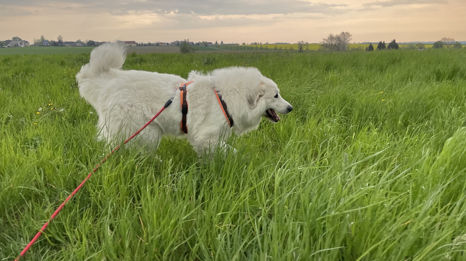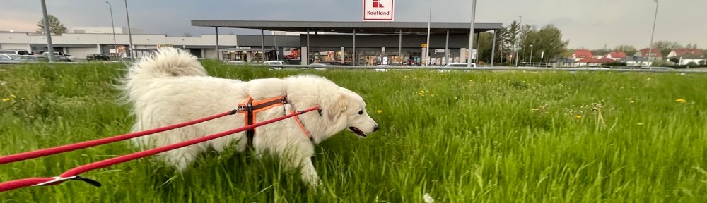 Meine große Menschin ist dann einkaufen gegangen und die Bella mit ihrem großen Mensch spazieren. Über den großen Parkplatz und da war eine Wiese am Rand. Und da sind wir langgelaufen. Und ich habe überall schön geschnuffelt.