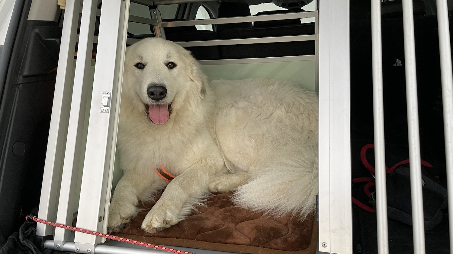 Ich habe auf dem großen Parkplatz erstmal noch eine Pause gemacht und mich hingelegt. Da habe ich ein paar Häppchen Trockenfutter geknabbert. Aber dann kamen die ersten Regentropfen und wir sind zurück zu meinem Auto. Dem weißen französianischen! Und ich habe es mir in meiner kleinen Reisebox hinten in meinem kleinen Zimmer mit dem großen Fenster gemütlich gemacht.