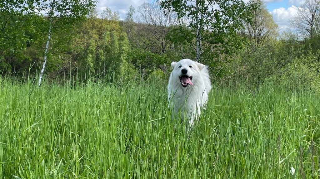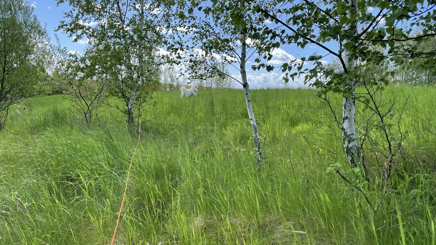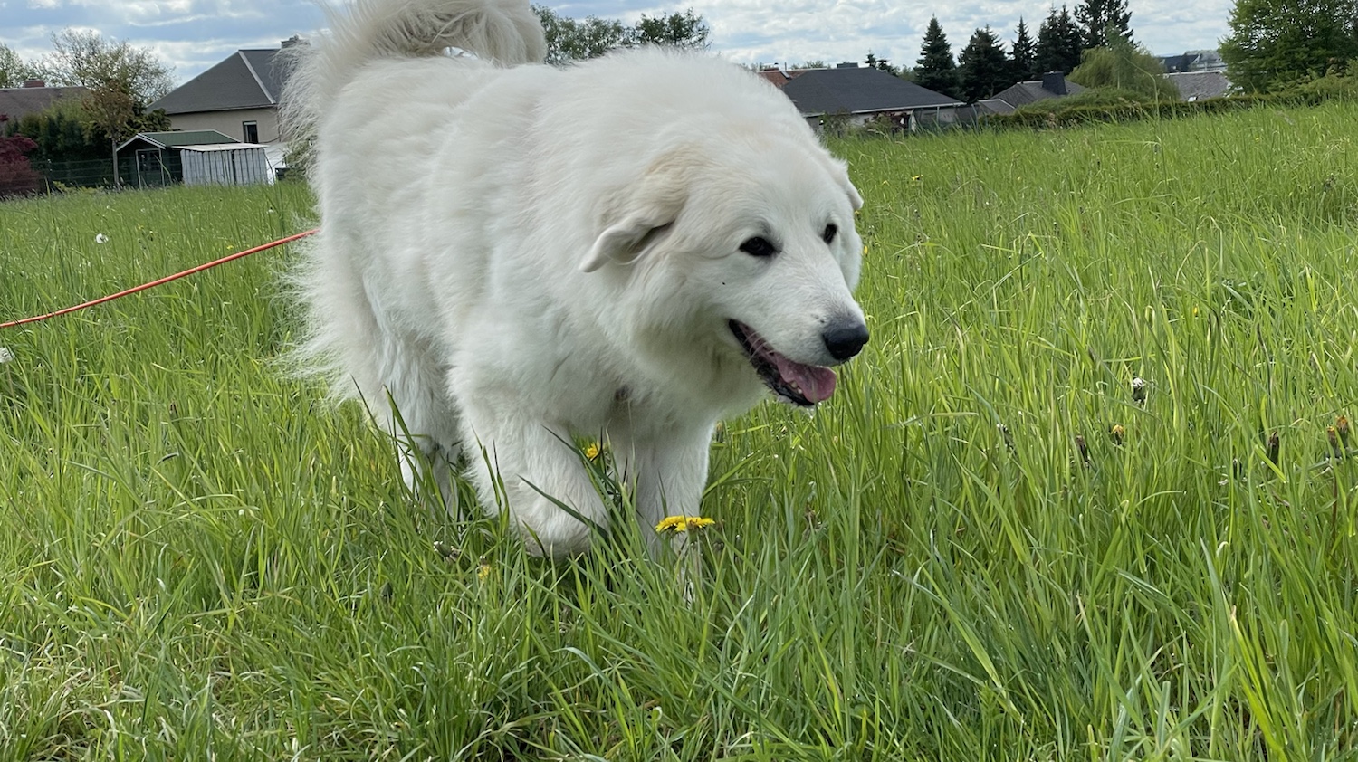 Dann sind wir oben über die kleine Wiese zur großen Wiese gelaufen. Auf der kleinen Wiese war das Gras ganz hoch. Das ist schön. Genau meine Höhe. Ich kann hüpfen und überall drübergucken. So gefällt mir das. Und dann haben wir noch zusammen schöne Bilder gemacht, bevor wir über die große Wiese und durch mein Wohngebiet nach Hause gegangen sind.