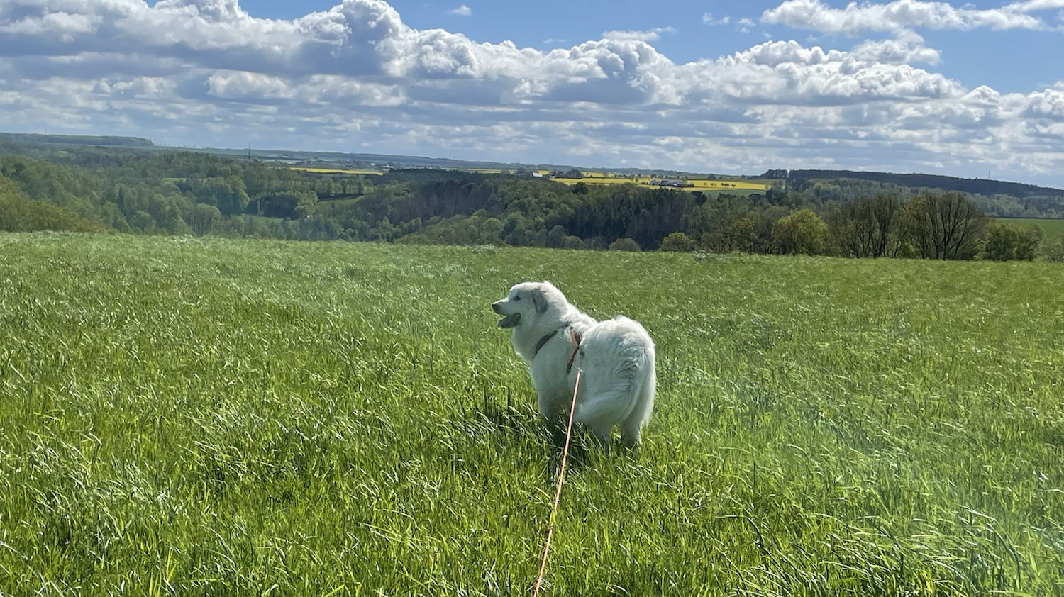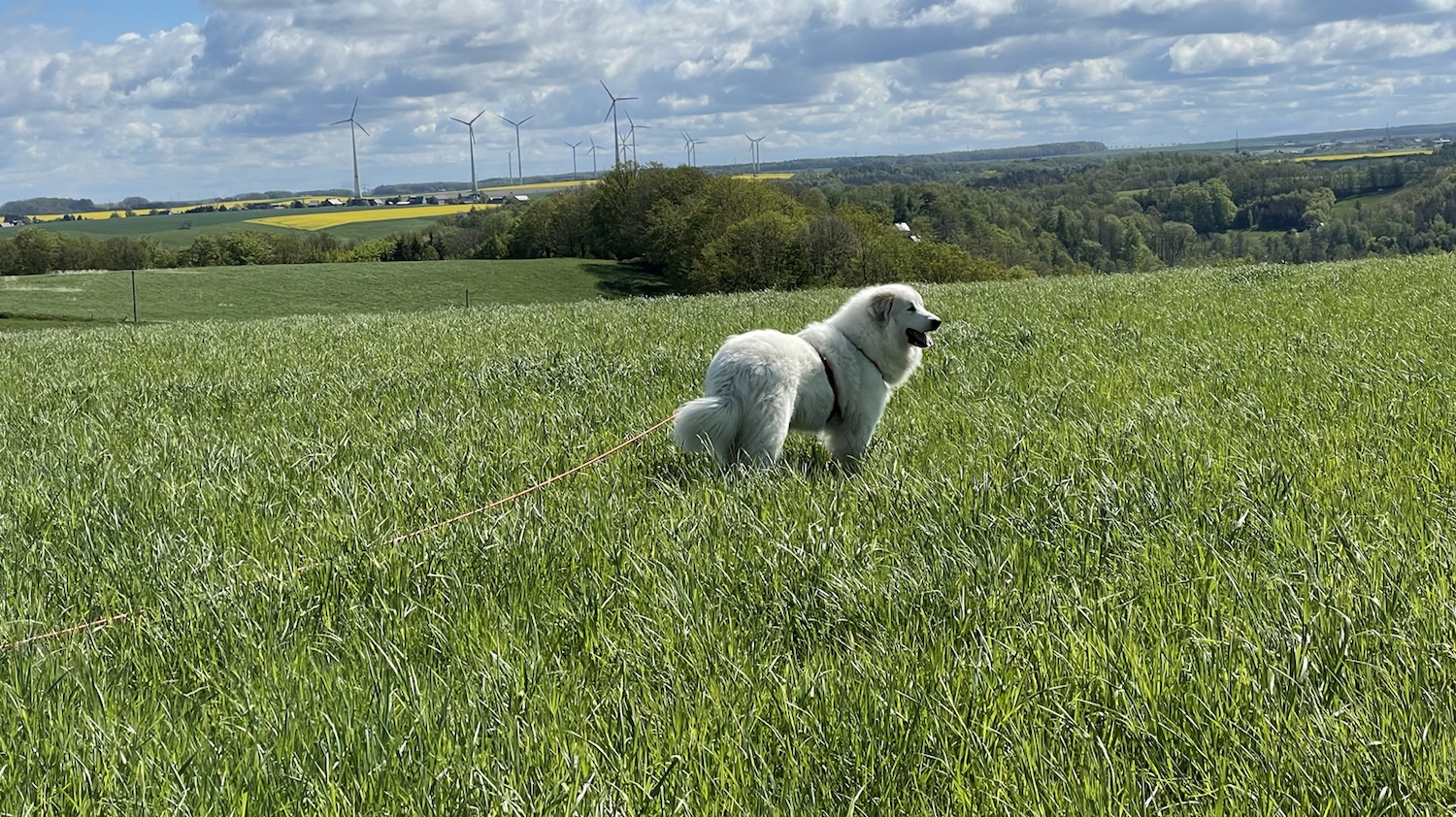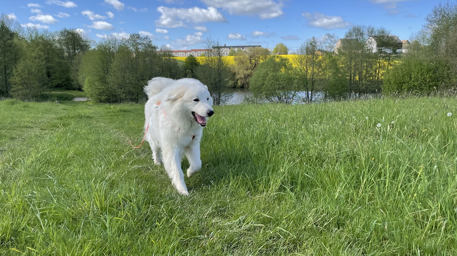 Und dann sind wir um das Rapsfeld herumgelaufen. Über die Wiese. Ich durfte schön überall schnuffeln. Mit meiner Pyrinase. Die ist sehr schön. Ich auch! Und ich bin durch das Gras gehoppelt. Das wird jetzt überall wieder schön hoch.