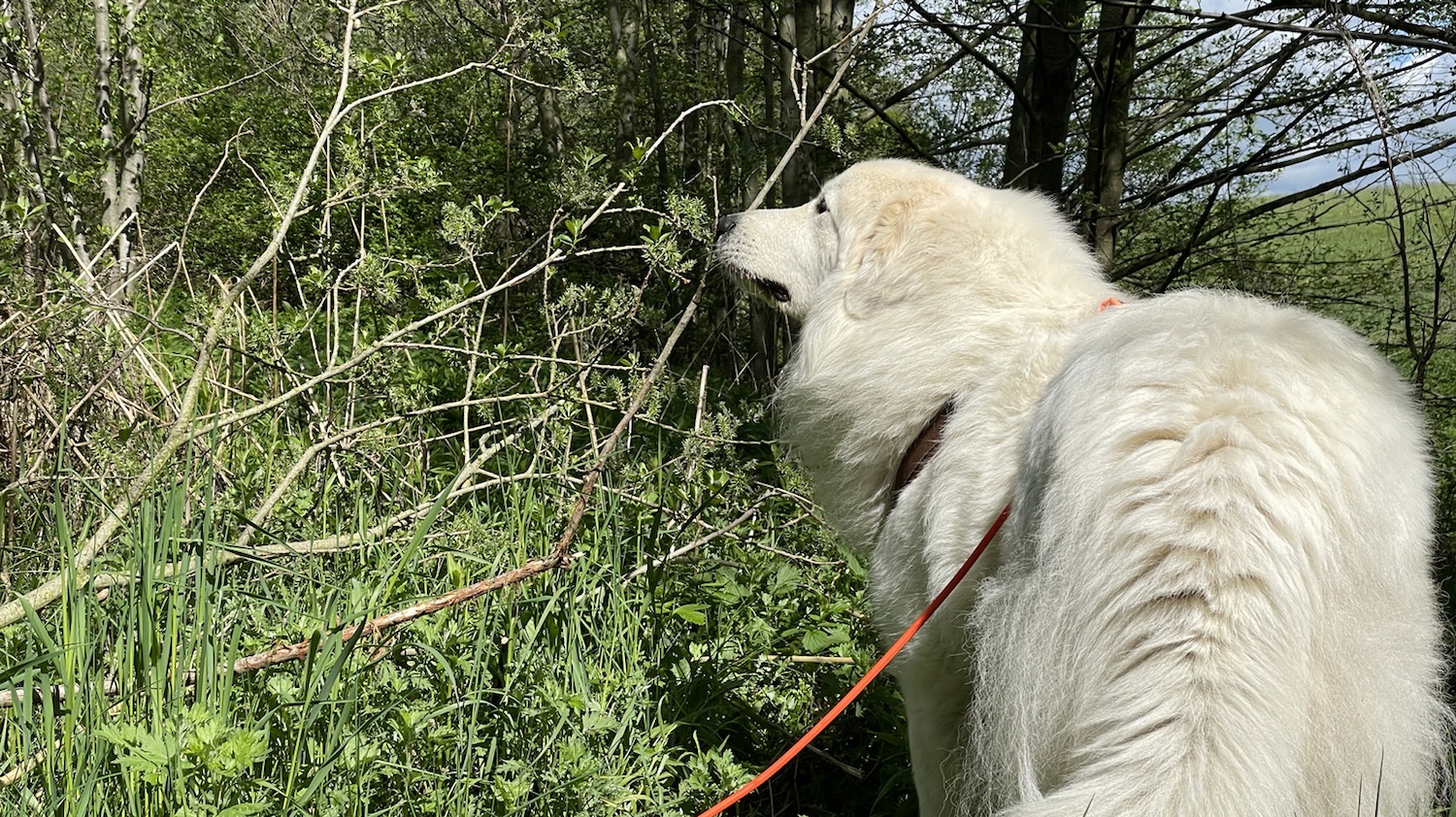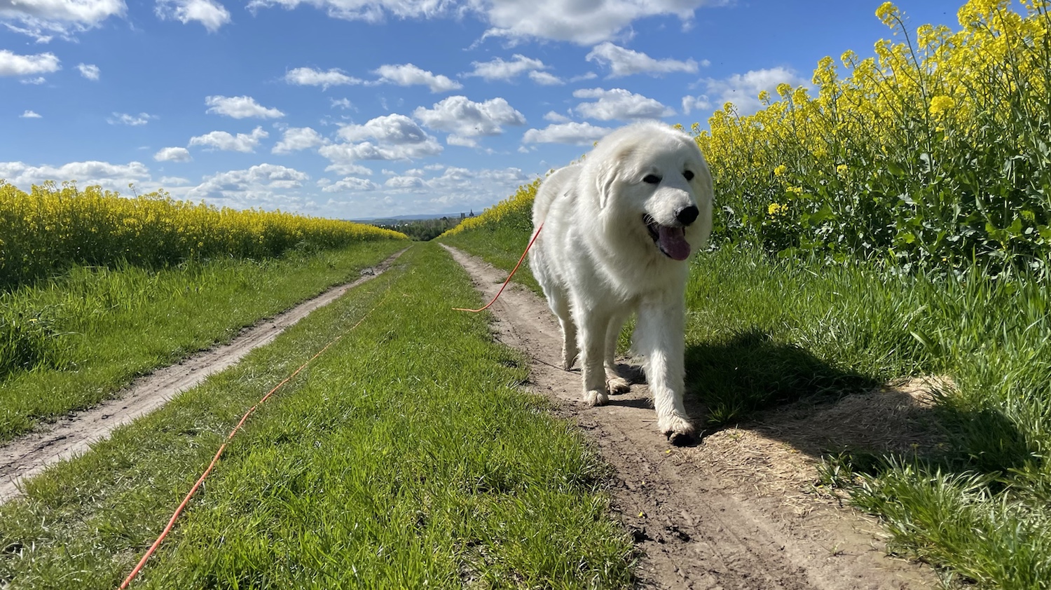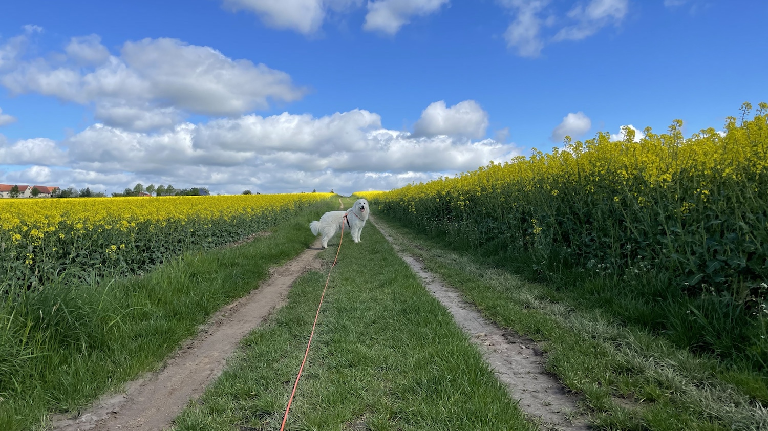 Wir sind dann aber weitergewandert zum großen Feld. Das blüht jetzt ganz schön leuchtendgelb. Rapsfeld, sagt mein großer Mensch. Und auf dem Feldweg lief vor uns ein Fuchs. Direkt auf dem Feldweg. Ich bin aber ganz ruhig gewesen und mein großer Mensch hat mich gelobt. Der Fuchs ist dann abgebogen. Ins Rapsfeld. Nach rechts. Die Bella weiß, was rechts und links und geradeaus ist. Ich bin eine Pyri. Wir sind geradeaus auf dem ganzen Feldweg gelaufen und ich habe geschnuffelt.