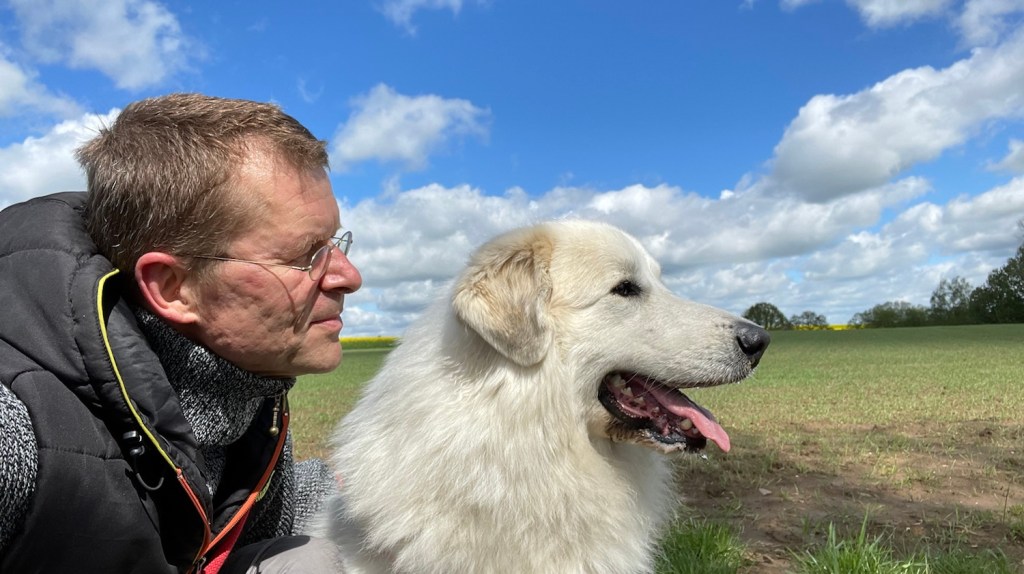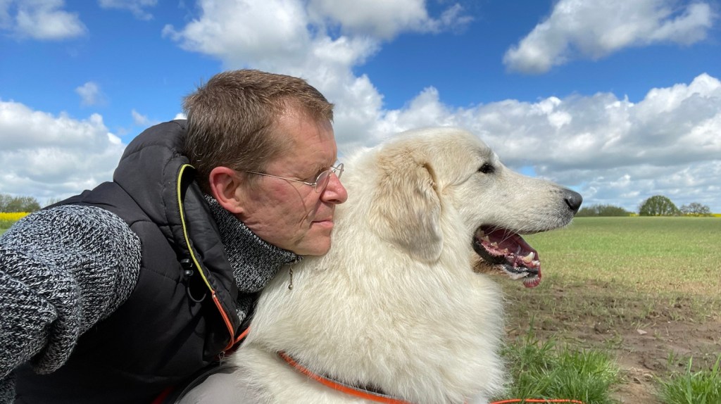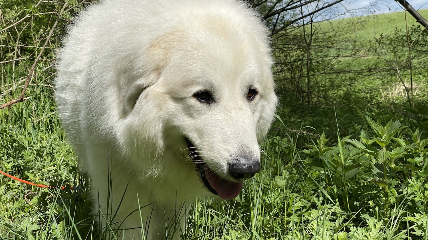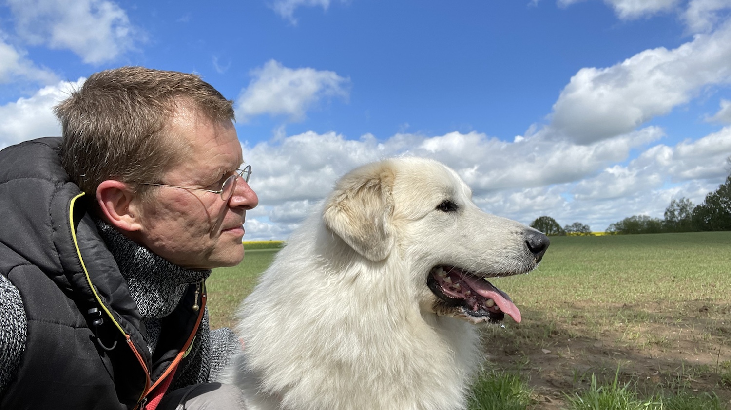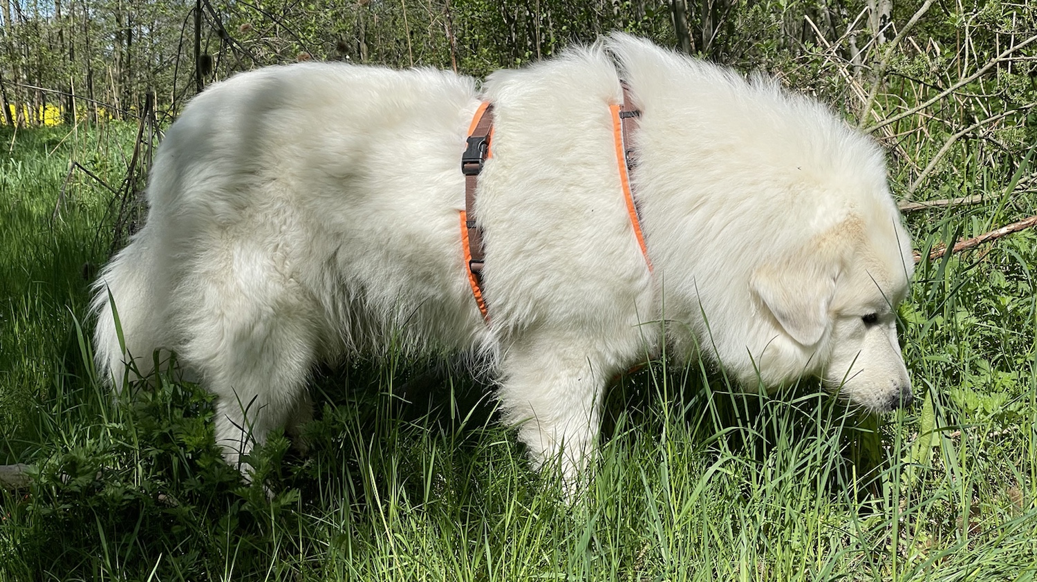 Wir sind dann aber weitergewandert zum großen Feld. Das blüht jetzt ganz schön leuchtendgelb. Rapsfeld, sagt mein großer Mensch. Und auf dem Feldweg lief vor uns ein Fuchs. Direkt auf dem Feldweg. Ich bin aber ganz ruhig gewesen und mein großer Mensch hat mich gelobt. Der Fuchs ist dann abgebogen. Ins Rapsfeld. Nach rechts. Die Bella weiß, was rechts und links und geradeaus ist. Ich bin eine Pyri. Wir sind geradeaus auf dem ganzen Feldweg gelaufen und ich habe geschnuffelt.