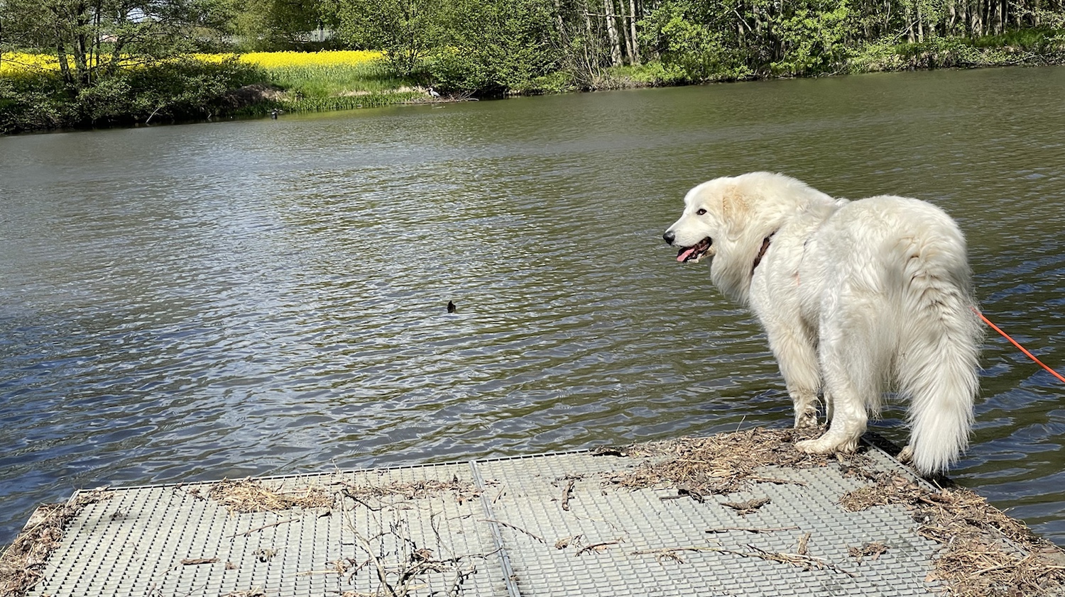 Weiter ging es dann zum Skihang und da bin ich in den kleinen Waldweg abgebogen und wir sind zurück zum Teich gewandert. Ich habe nochmal Wasser getrunken und der Reiher war auch noch da. Wir kennen uns jetzt und er fliegt nicht mehr vor der Bella weg. Weiiil, ich bin sehr lieb.