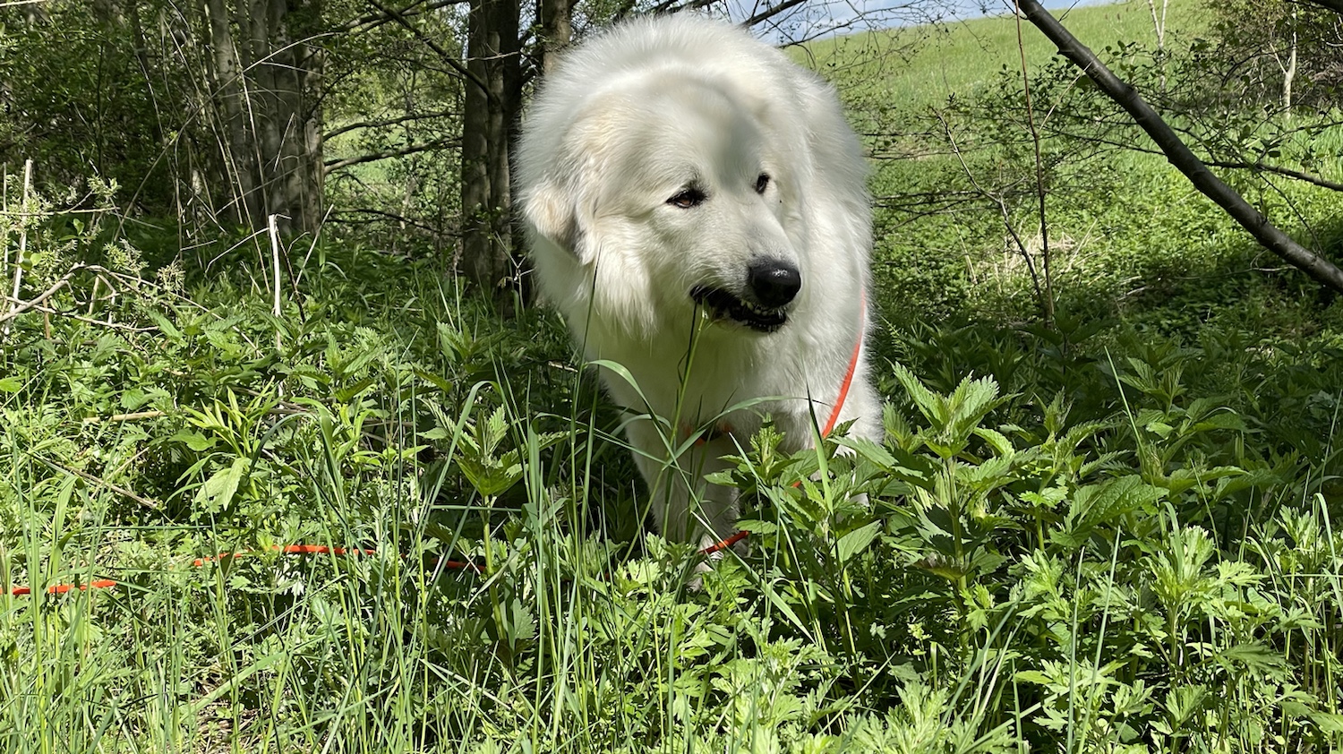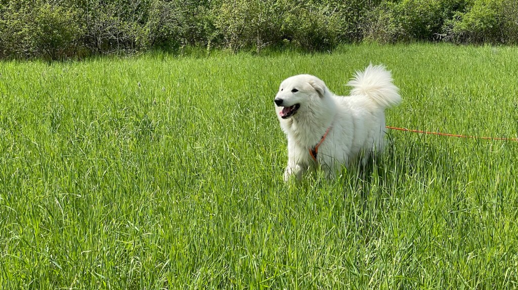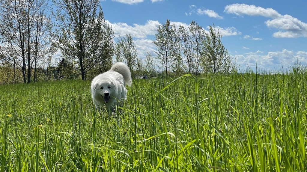 Und dann sind wir um die kleine Wiese gelaufen. Ich habe überall erstmal geschnuffelt und Gras gekaut. Das mache ich gerne. Beides. Deshalb nennt mich mein großer Mensch manchmal sein kleines Schäfchen.