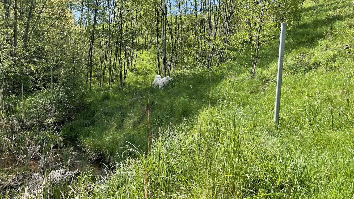 Und als wir dann am kleinen Tümpel gewesen sind, da habe ich die Rehe gesehen. Auf der kleinen Wiese oben. Zwei Rehe. Da mußte ich natürlich hin. Aber die sind ganz schnell weg gewesen. Ich war ganz aufgeregt und habe schnell noch meinen großen Mensch geholt. Der hing ja noch am anderen Ende meiner langen orangenen Feldleine.