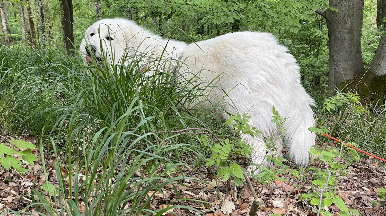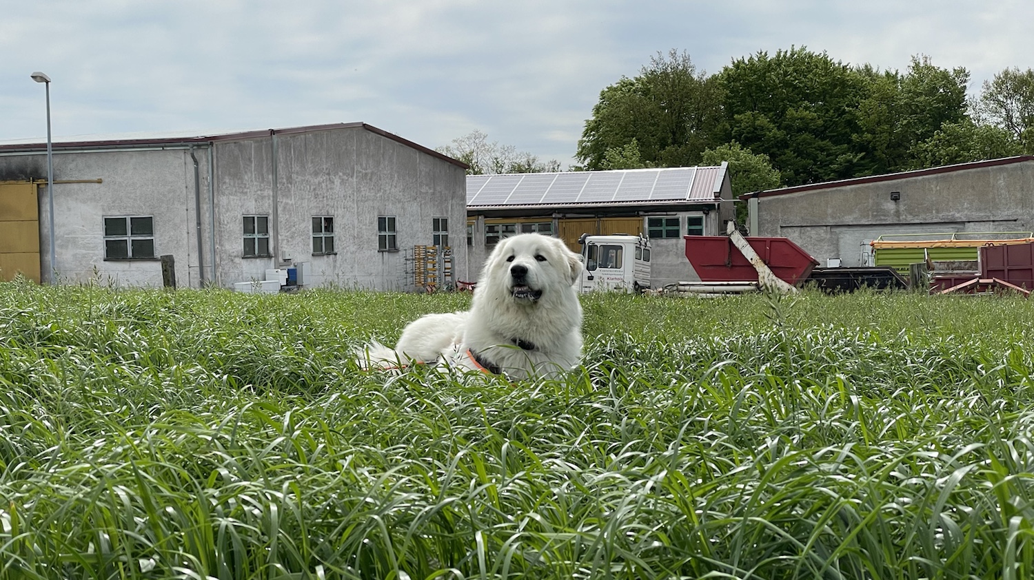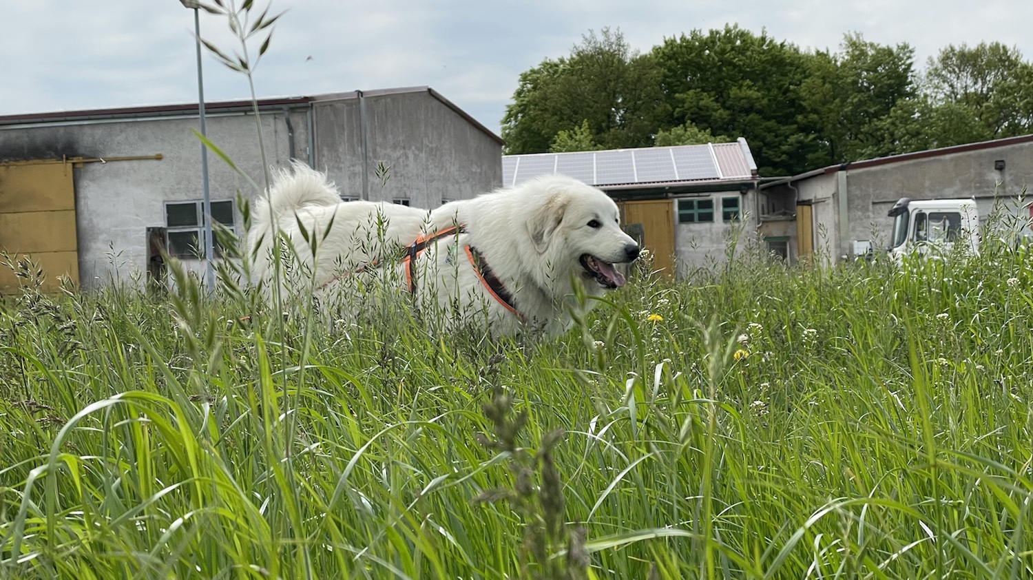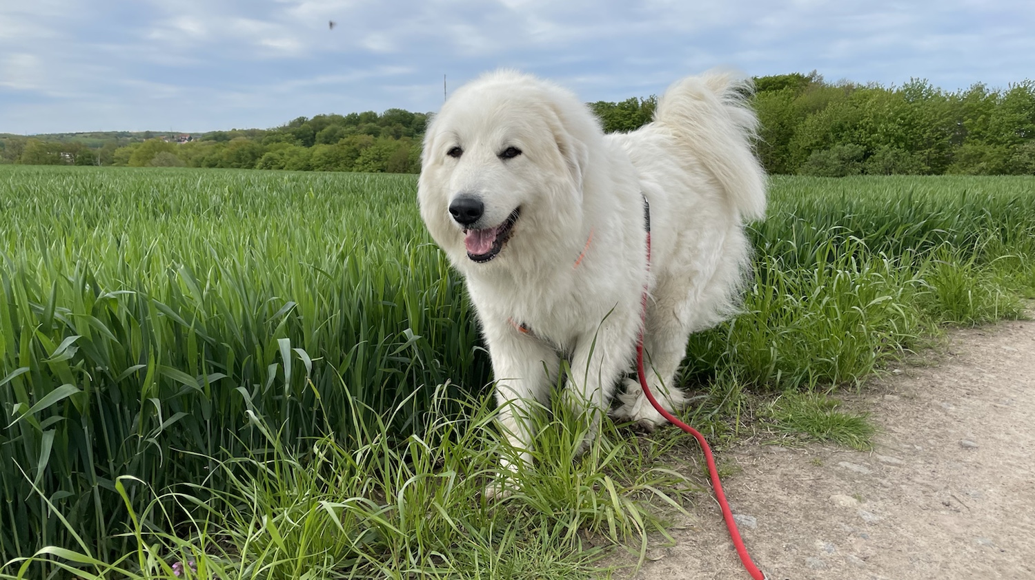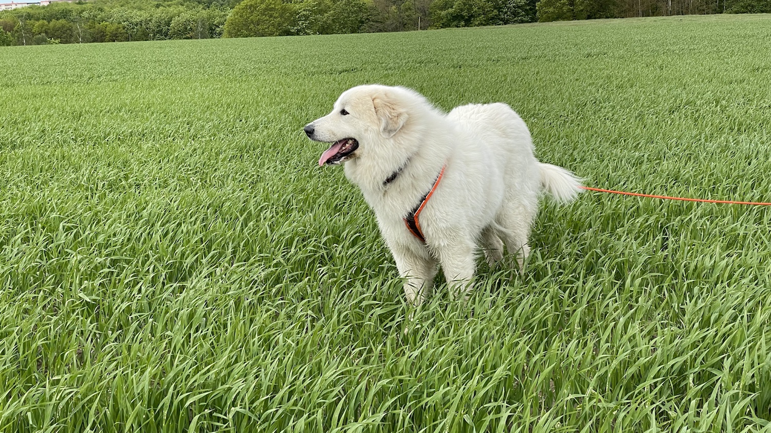 Ich habe erstmal eine Pause mit meinem großen Mensch gemacht und mich am Waldrand ausgeruht. Dann sind wir ein Stück auf dem Feldweg Richtung große Straße gegangen und dann weiter auf dem Feld in der Traktorspur. Bis zur Wiese auf der anderen Seite der großen Straße. Dort ist das Gras jetzt fast so hoch wie ich.
