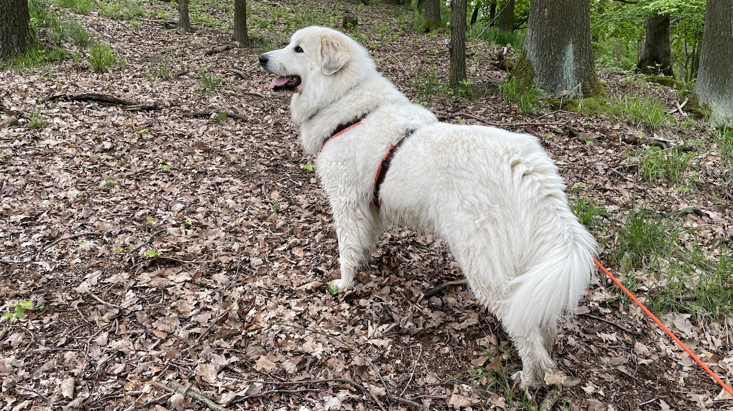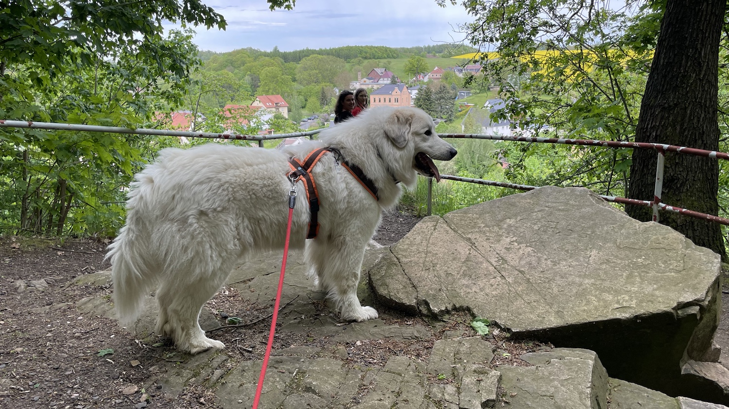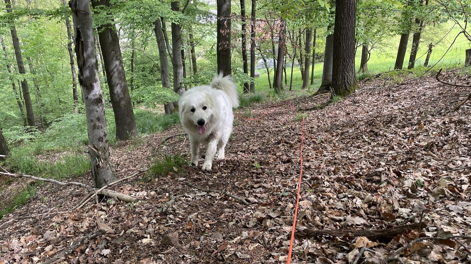 Ich habe erstmal mit meinem großen Mensch gekuschelt und dann schön gefrühstücksfuttert. Mein großer Mensch hat dann auch gefrühstücksfuttert und ich habe inzwischen in meinem Garten brav gewartet. Aber dann sind wir losgewandert.