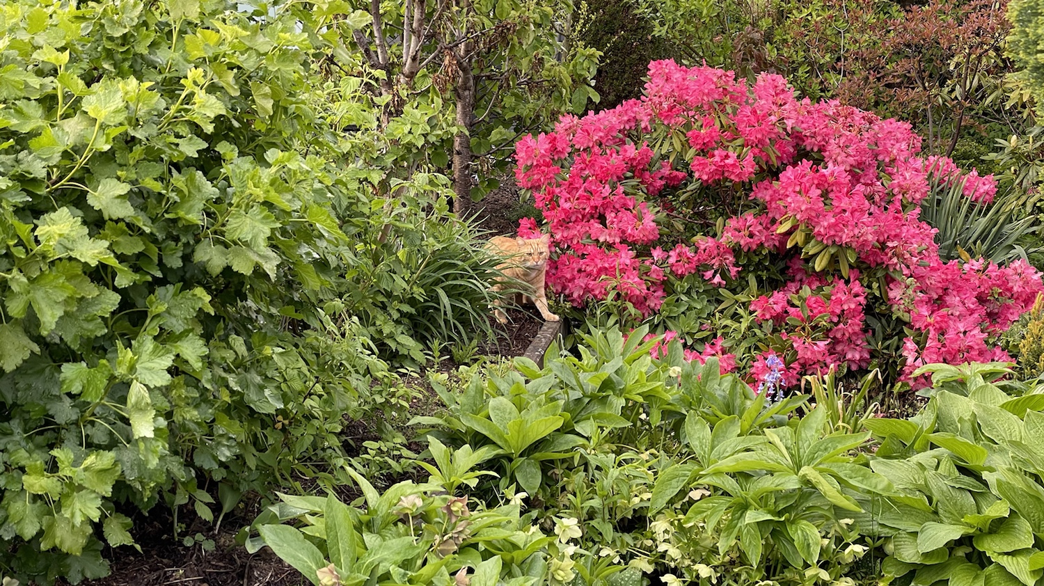 Ich habe jetzt einen ganz schönen Platz an meinem Zaun. Direkt im Gestrüpp. Da ist ein ganz großer Busch – Kirschlorbeer. Und da kann ich ganz gut liegen, schlummern und bewachen. Alles gleichzeitig. Und wenn es mal regenwettert, wie heute, da werde ich dort auch nicht gleich naß. Das ist praktisch. Manchmal gehe ich auch in meine Kellerwohnung, wenn es zu sehr regenwettert.