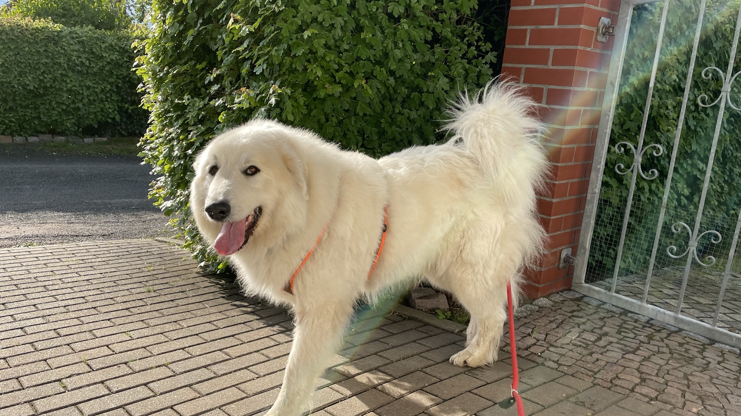 Wir sind heute durch die Siedlung gelaufen. Und ich war ganz lieb. Und beim Aaron sind wir auch gewesen. Der war aber nicht in seinem Garten. Dafür haben wir den Charlie getroffen. Der saß gegenüber vom Aaron seinem Garten.