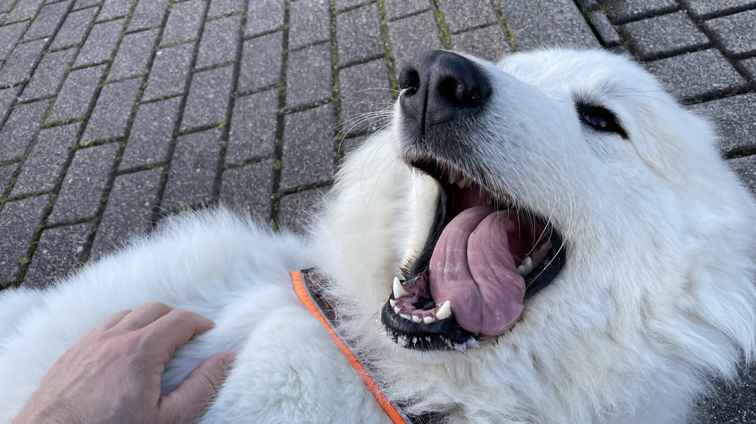 Ich habe heute drei Pausen gemacht. Bei meinem Abendspaziergang durch mein Wohngebiet. Und da habe ich gekuschelt und mit meinem großen Mensch rumgekaspert. Das war ganz lustig.