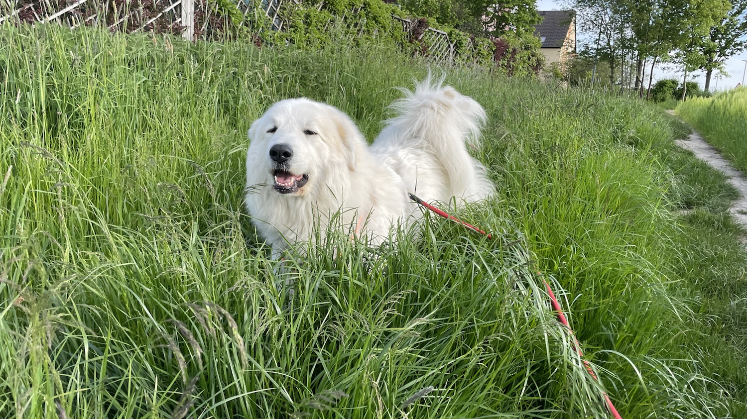 Wir sind der Dalmatinerin dann ein Stück hinterhergelaufen und dann auf die große Wiese hinter meinem Wohngebiet abgebogen. Da bin ich dann mit meinem großen Mensch eine schöne Runde über die große Wiese gelaufen. Am schönsten ist es im hohen Gras. Das gefällt mir.