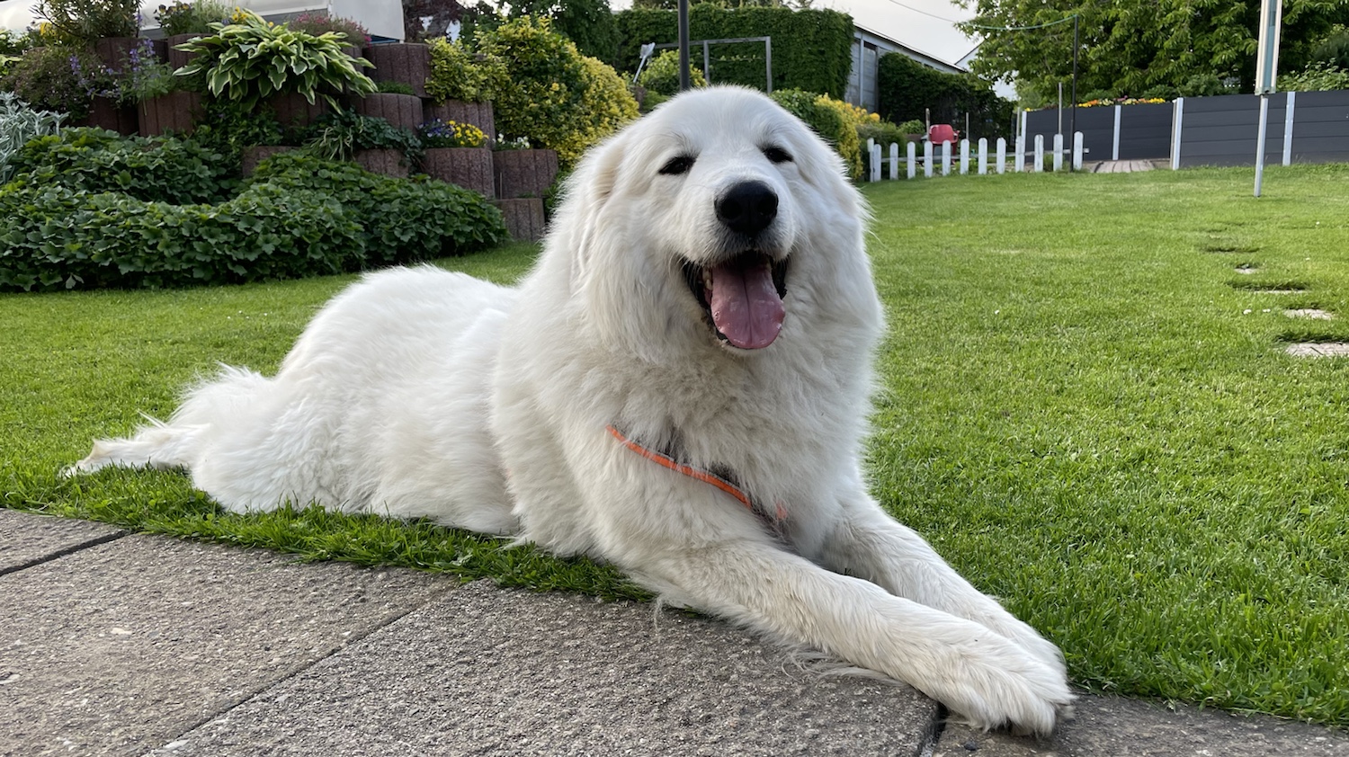 Und dann haben wir einen Abendspaziergang gemacht. Mein großer Mensch und ich. Seine Bella. Ich bin nämlich die Bella von meinem großen Mensch. Eine Pyrenäenberghündin bin ich. Eine wunderschöne! Jawoll! Wie meine Mami Ivy. Die ist auch so wunderschön. Wir sind durch mein Wohngebiet gelaufen.