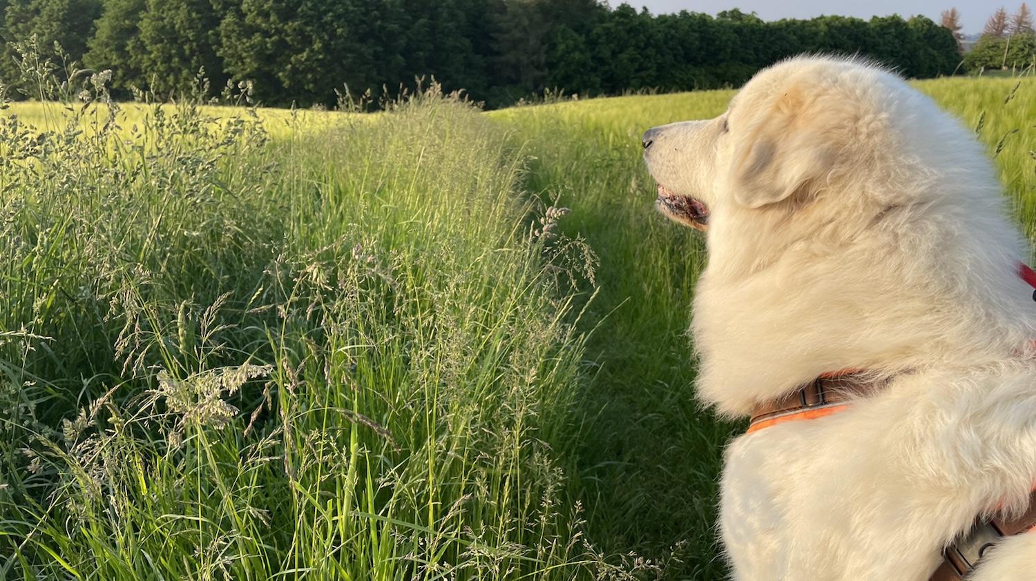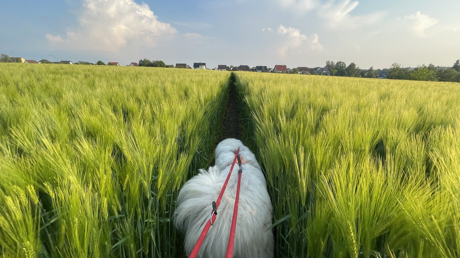 Ich bin dann aber auch erstmal mit meinem großen Mensch abendspazierengegangen. Zuerst durch mein Wohngebiet. Und dann sind wir auf den Feldweg abgebogen. Auf das Getreidefeld.