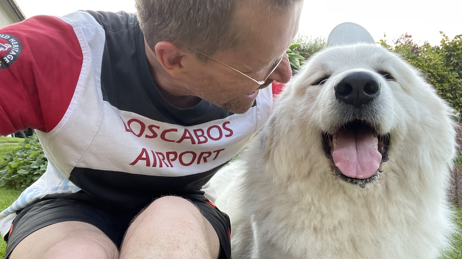 Dann bin ich noch eine kleine Runde mit meinem großen Mensch durch mein Wohngebiet und zurück nach Hause gelaufen. Wir sind dann noch in meinem Garten zum Kuscheln gewesen. Da hat sich mein großer Mensch mit zu mir auf die Wiese gesetzt.